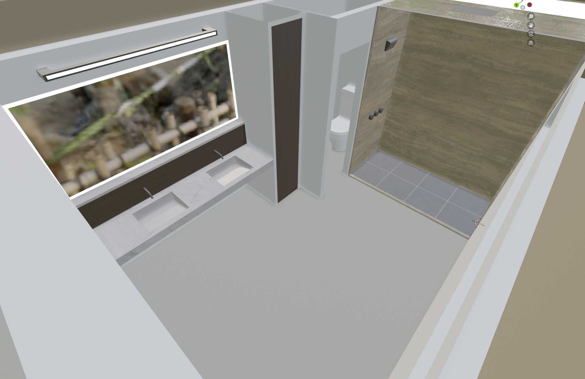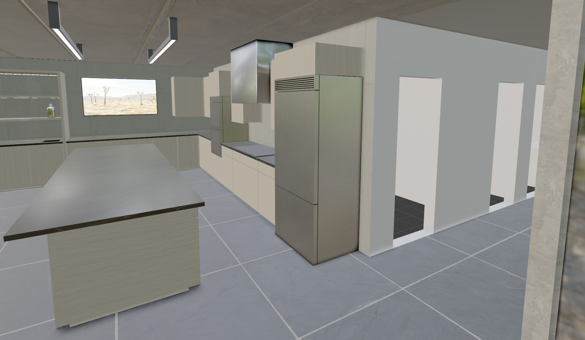 The renders you’ll see below reflect a general architectural vision, and not a truly finished home. For instance, you’ll notice that I’ve included no air vents, no electrical outlets, and no interior doors. I didn’t feel that this level of detail was necessary to communicate my vision, and doors often obscure an understanding of spatial relationships between rooms. Furthermore, some elements of the home might not be structurally feasible, particularly the “fish bowl” dining room where the walls are made of unsupported glass (even thick aquarium glass doesn’t behave well under vertical compressive force). In any case, my goal was to simply communicate my general vision for space, flow, light, style, and material, which I hope I’ve achieved.