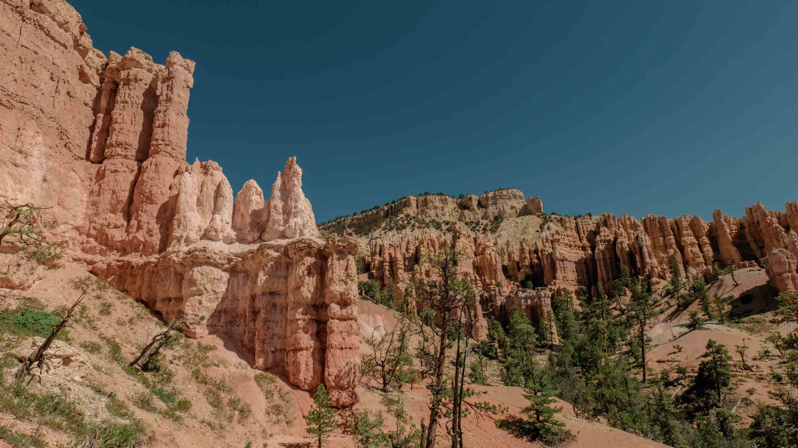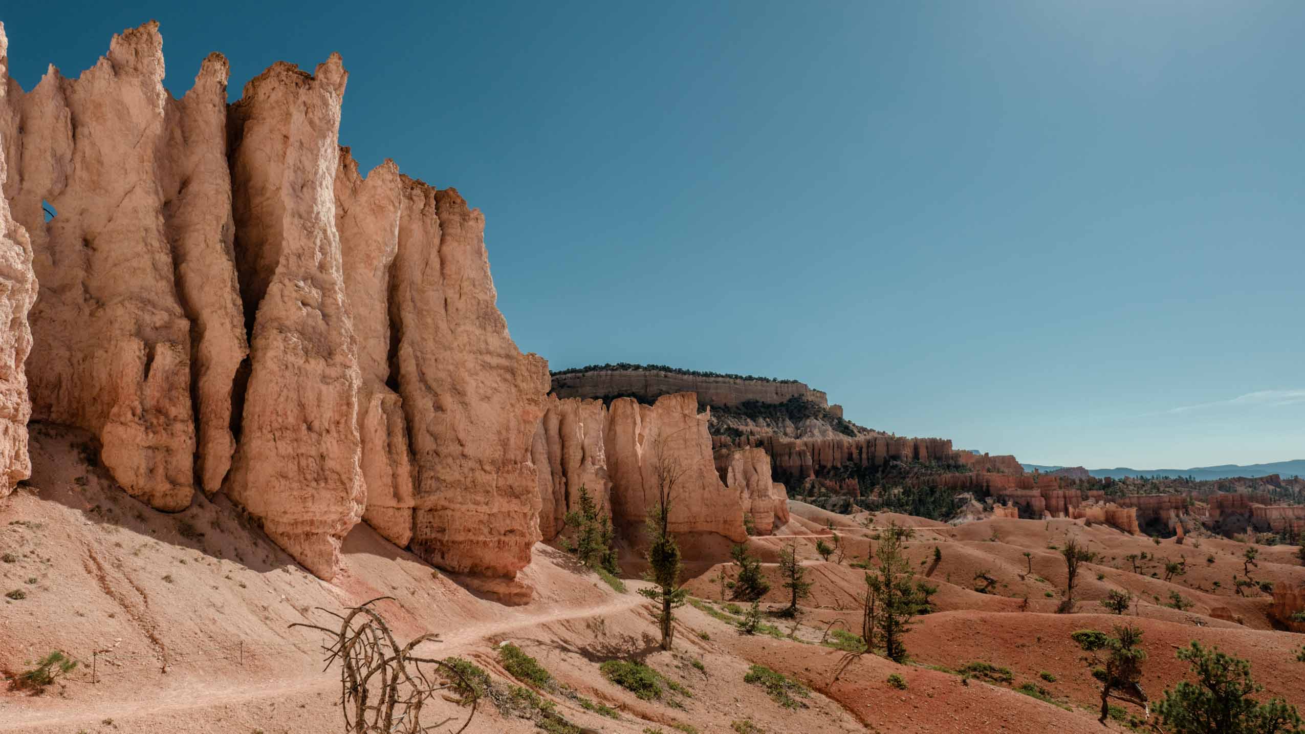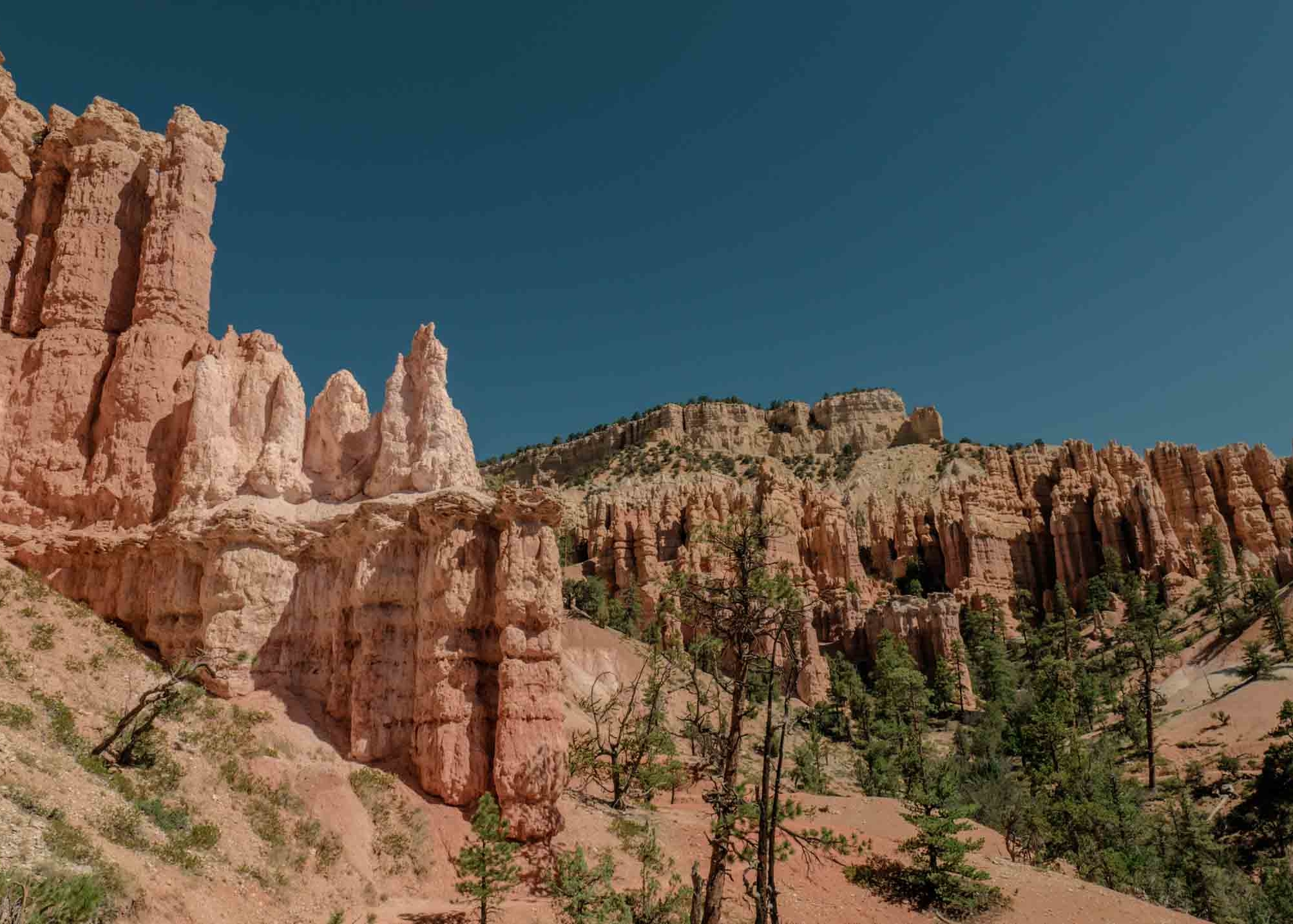 The trail continued winding back and forth with intermittent inclines leading us to vantage points from where we could look down on more clustered hoodoos faces, followed by declines which sent us back down along cliff faces. We continued like this for a few miles until we reached the low point of the hike. And reaching this point meant that the second half was essentially a constant climb. Up to this point, we had neglected to take any real break to rehydrate and refuel, having never passed a nice shady spot to avoid the direct sunlight.