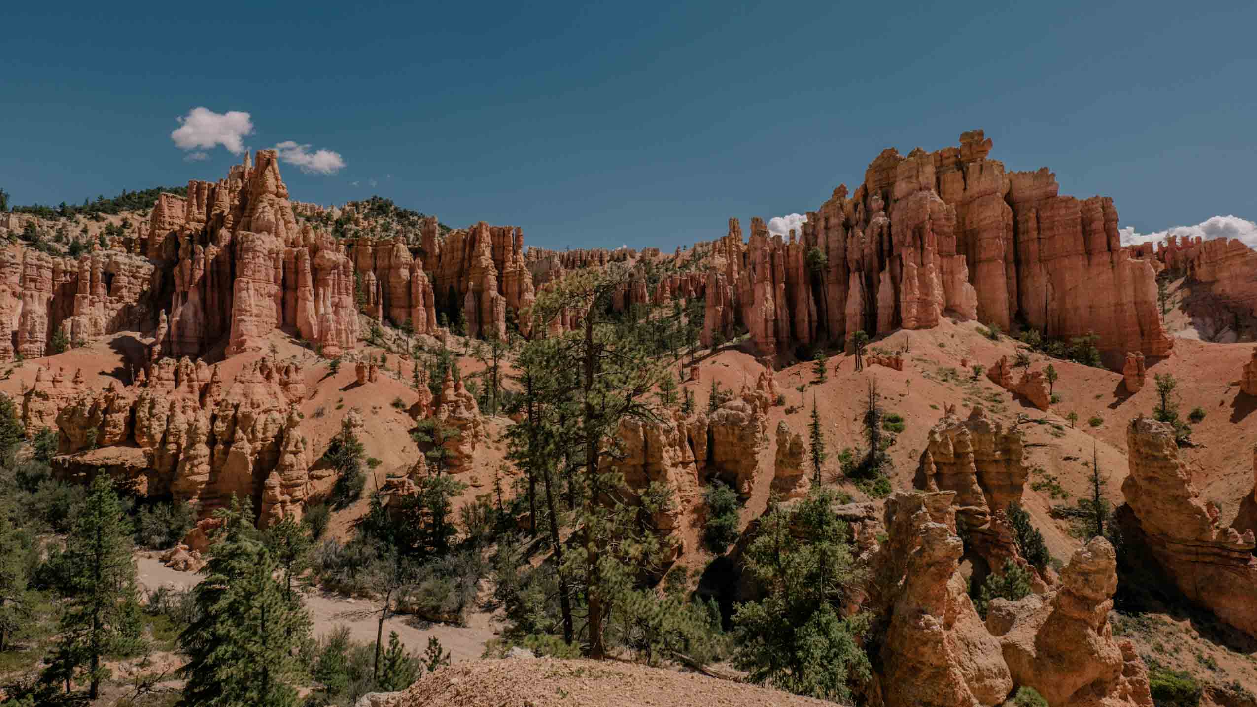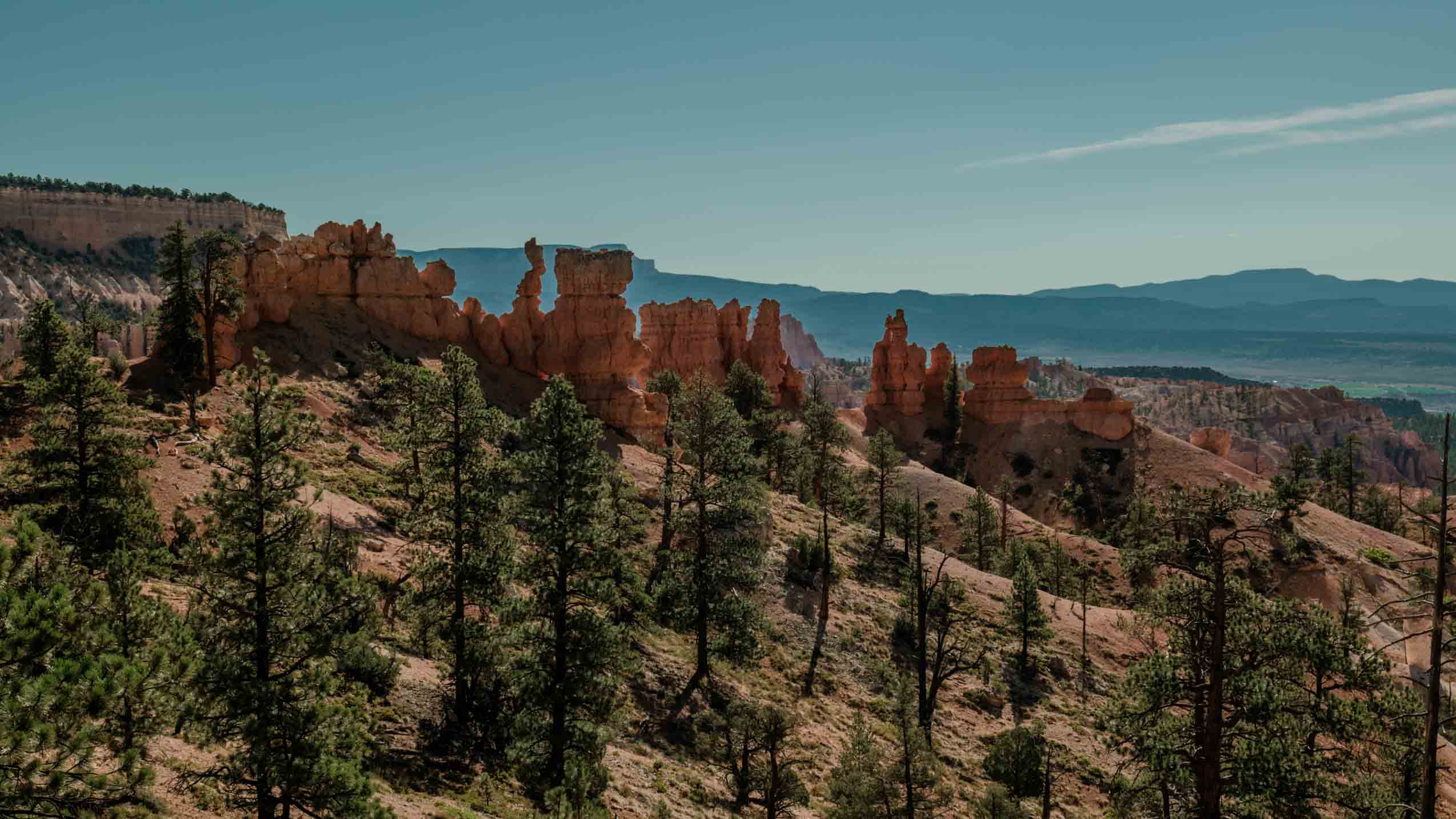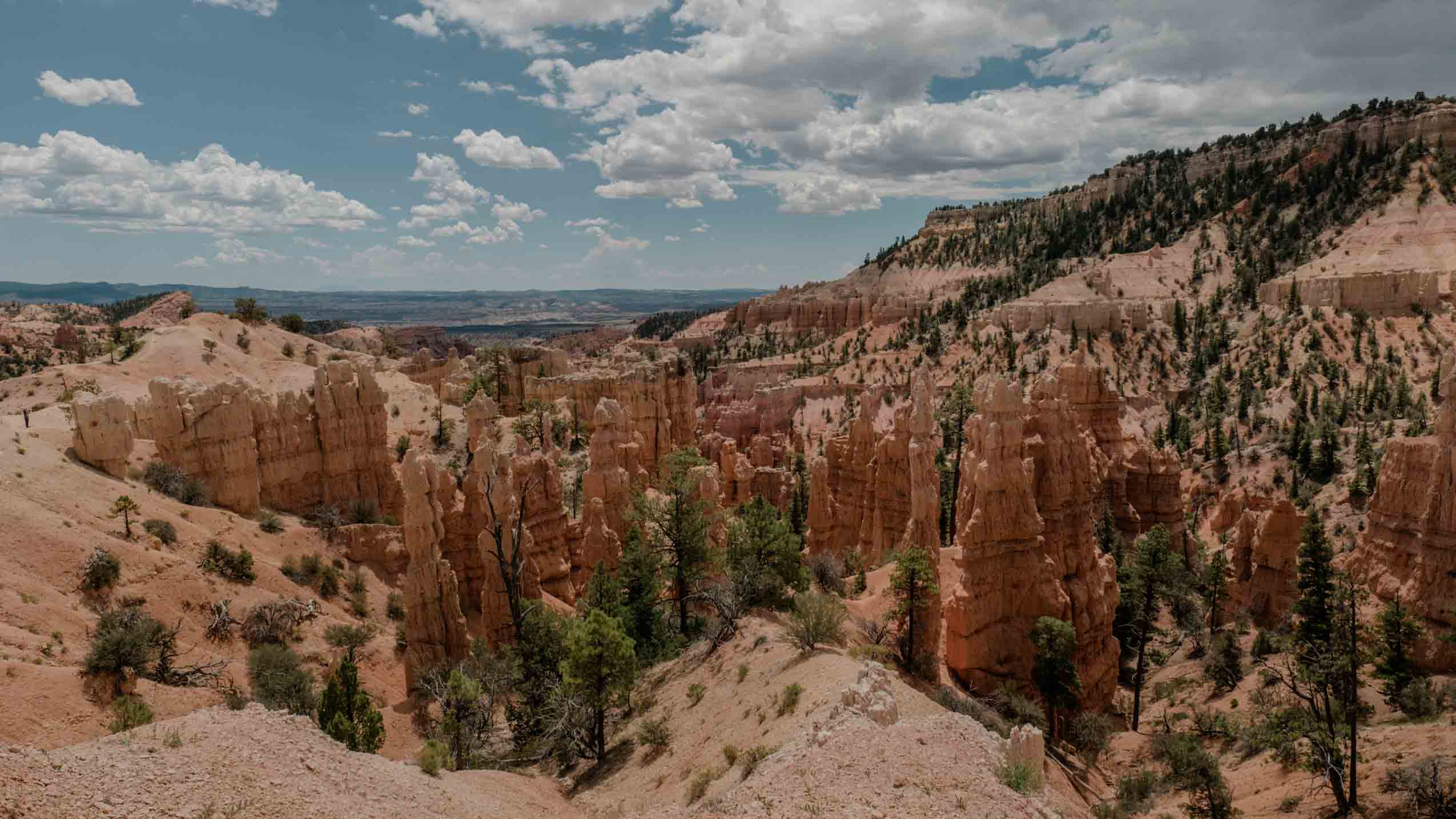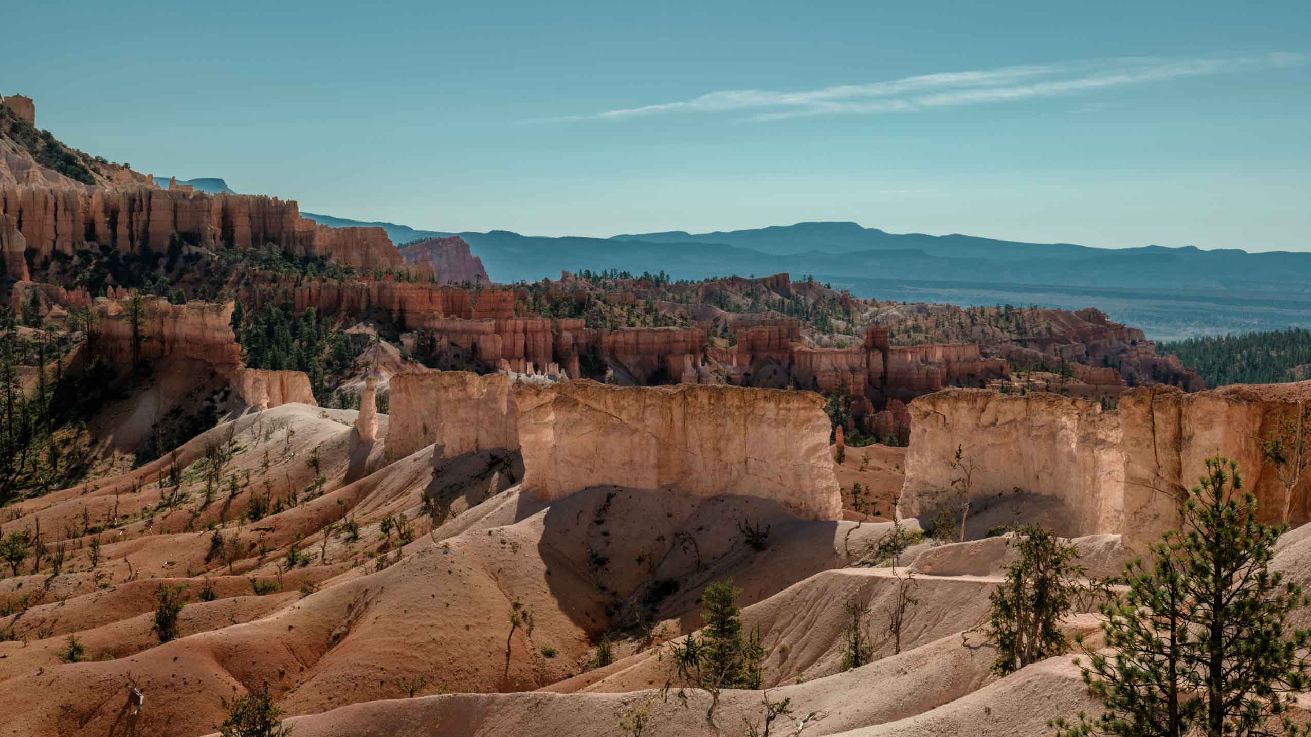 Wanting a full day in the park, we hit the road early before most others were awake. We drove past forests made interesting by their undulating geography and massive red rock formations that intermittently stood above the trees. About an hour and twenty minutes later, we pulled into the parking lot of the Bryce Canyon National Park Visitor Center to plan our day of hiking. A few minutes later we were back in the car, Deneen Pottery mug in hand to add to my collection, with a plan to hike the 7.8 mile Fairyland Loop Trail. After driving a bit further into the park and securing a parking spot, we were off to begin our hike.