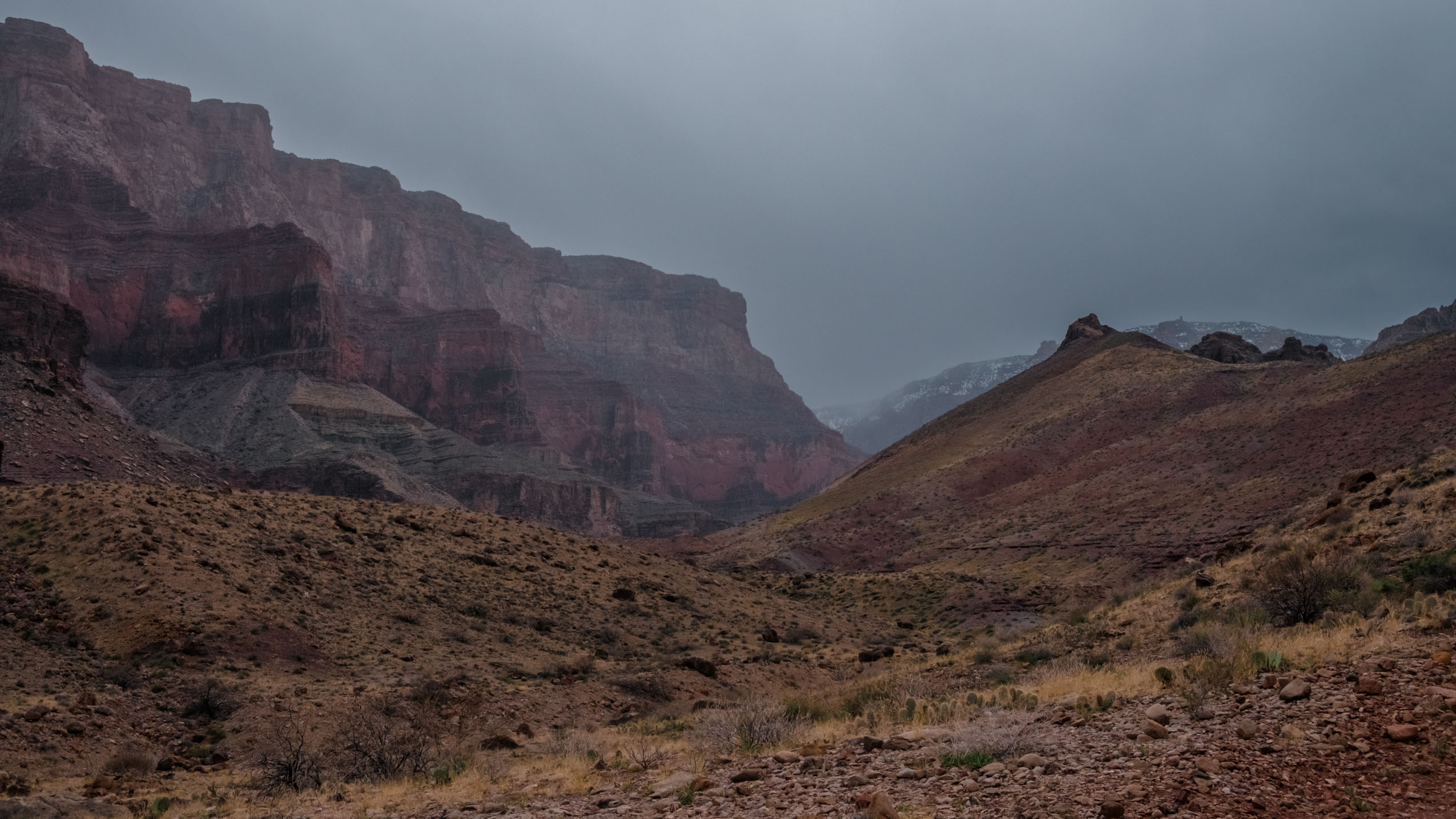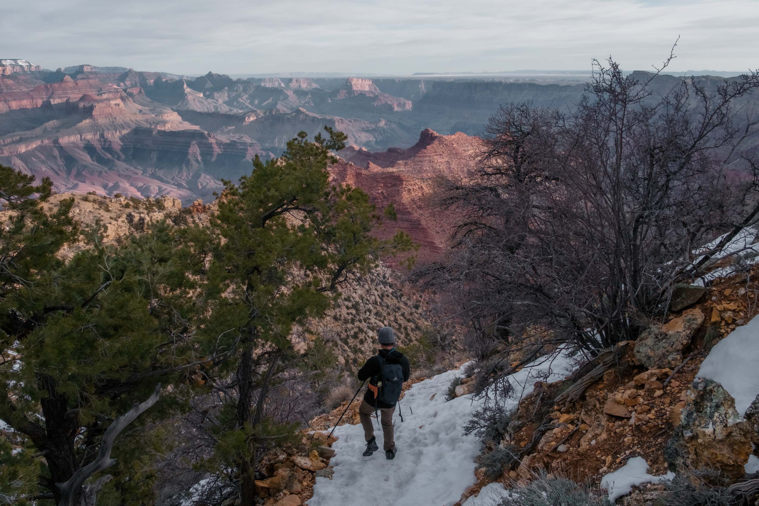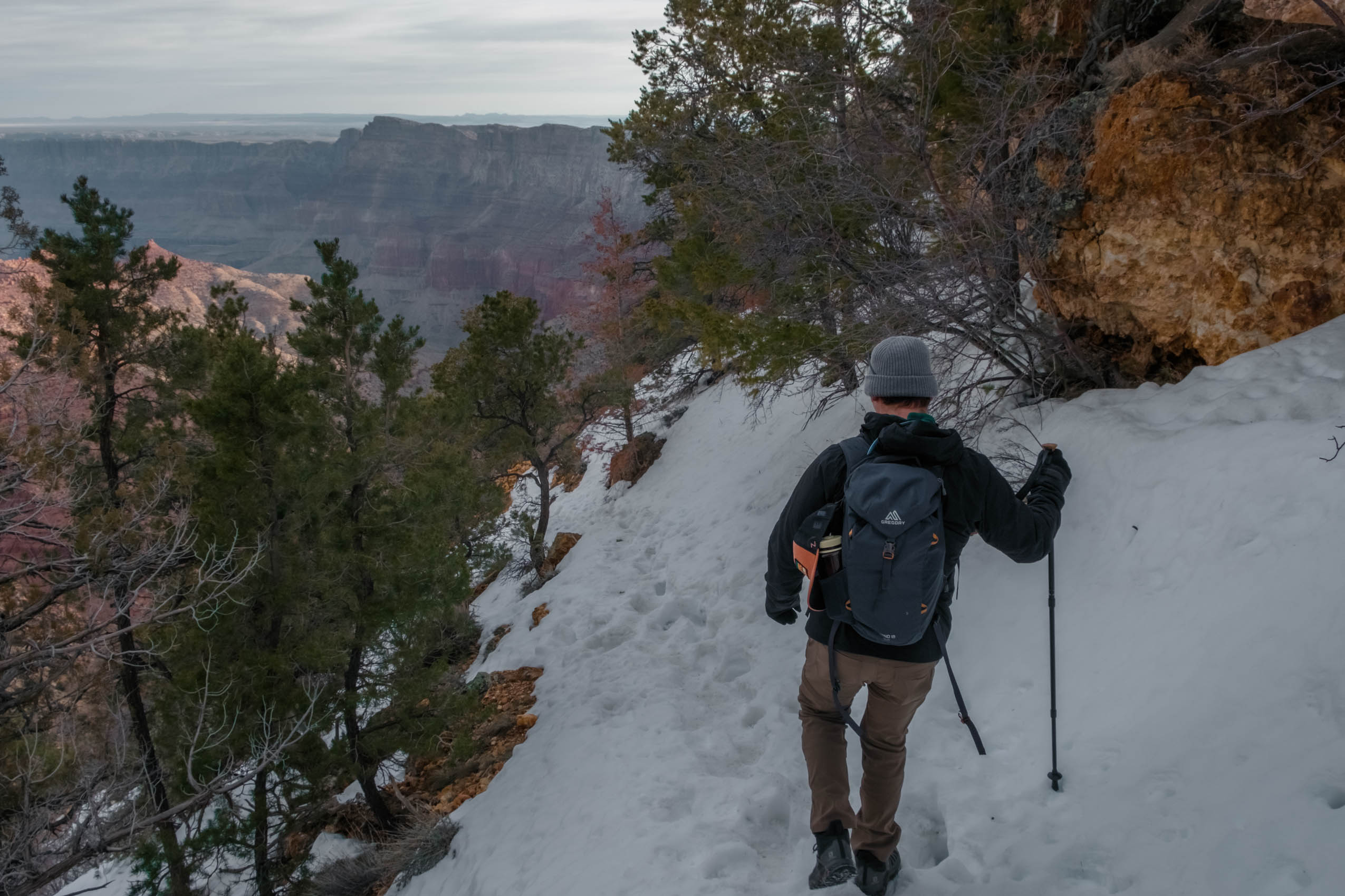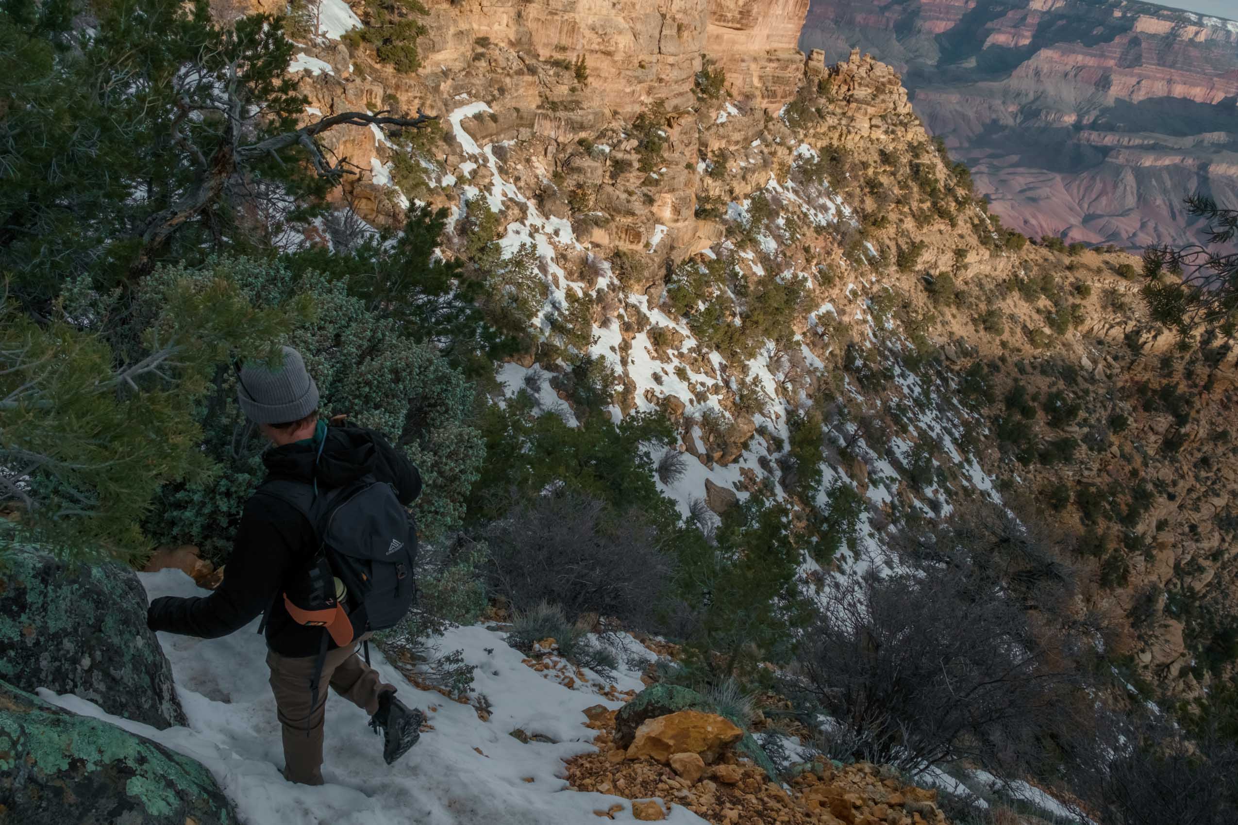 We arose before the Sun and headed into the park, stopping briefly at the trailhead to look down on this somehow more rugged-appearing portion of the canyon. And then, we set off. Our progress was slow at first as we traversed a seemingly endless collection of switchbacks covered by about two feet of snow, being careful not to lose our footing on the slush. Eventually, the snow was behind us and our pace picked up, but just barely. The trail is not well defined in some spots, forcing some time expenditure in route finding. Furthermore, the trail is intermittently covered by grapefruit sized rocks, requiring near constant attention to your footing. In fact, during one of our mid-trail breaks, I gave my attention a break while standing still taking in the views and a minor repositioning of my foot caused me to awkwardly step on a perfectly positioned rock and roll my ankle. This anterior talofibular ligament sprain reared its head a few times throughout this hike in the form of searing pain and unexpected collapses, and I’ve been dealing with the residual instability ever since.
