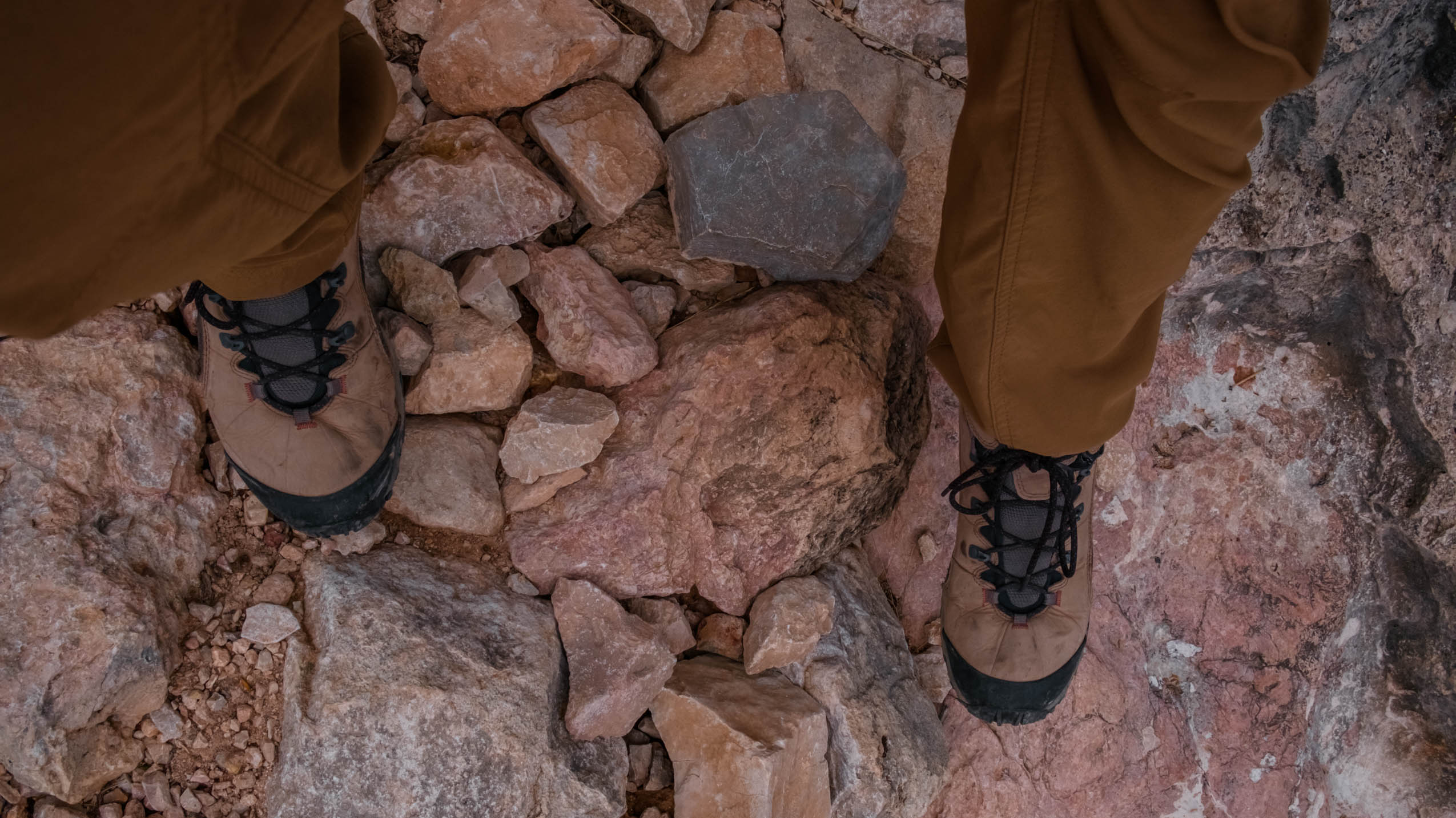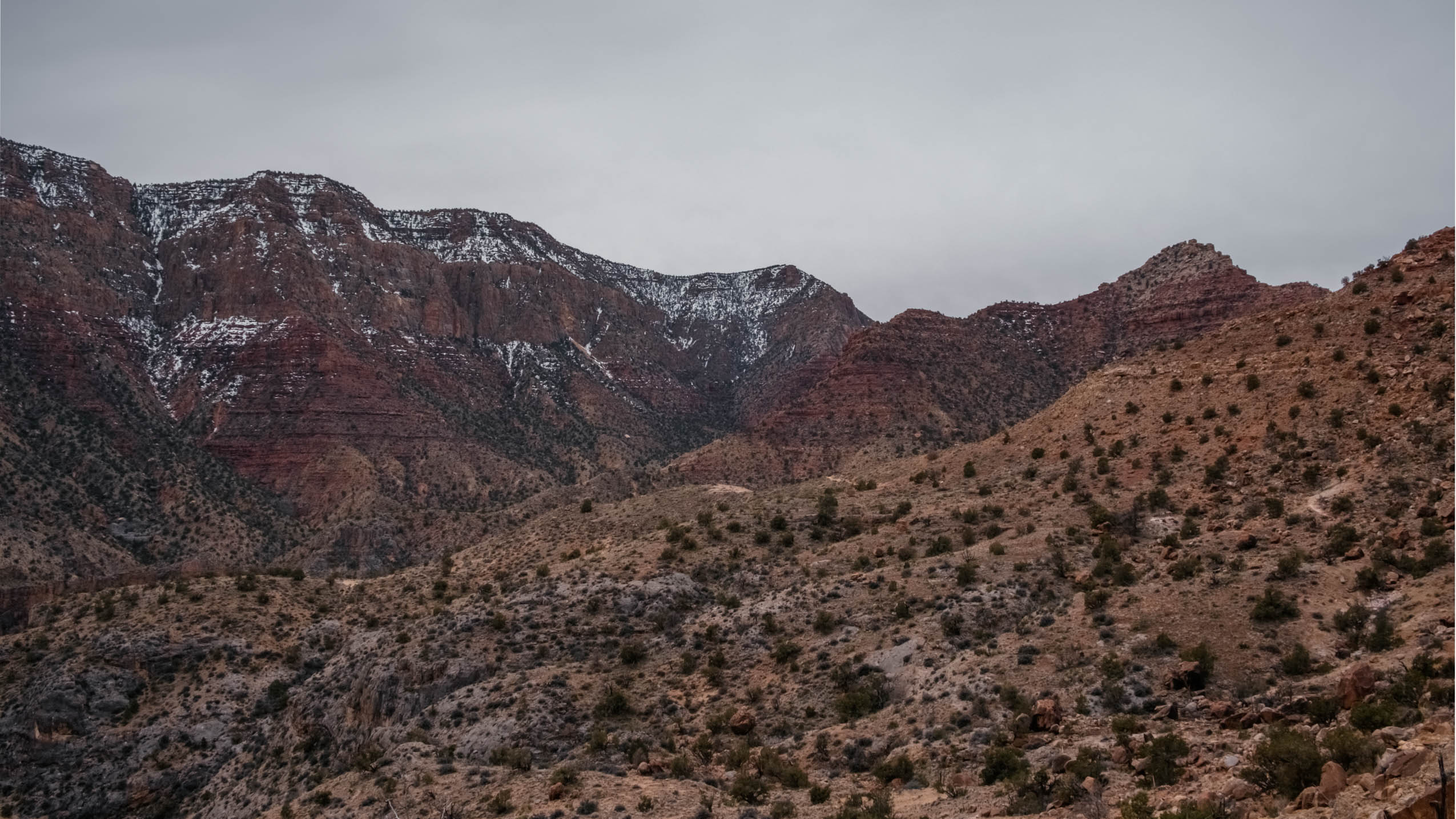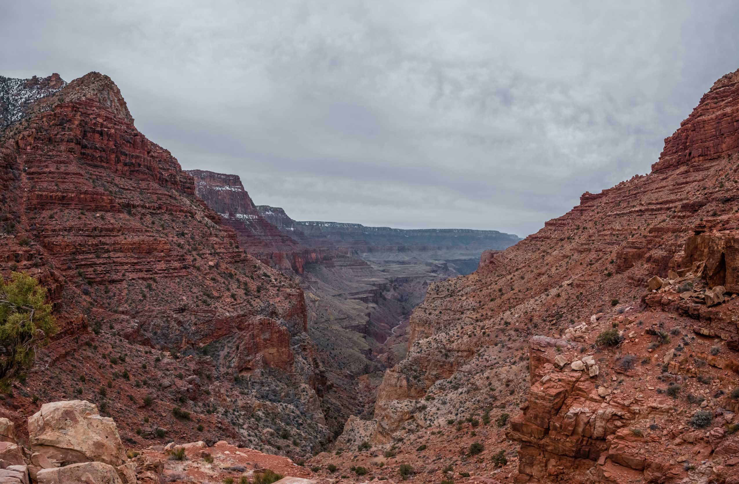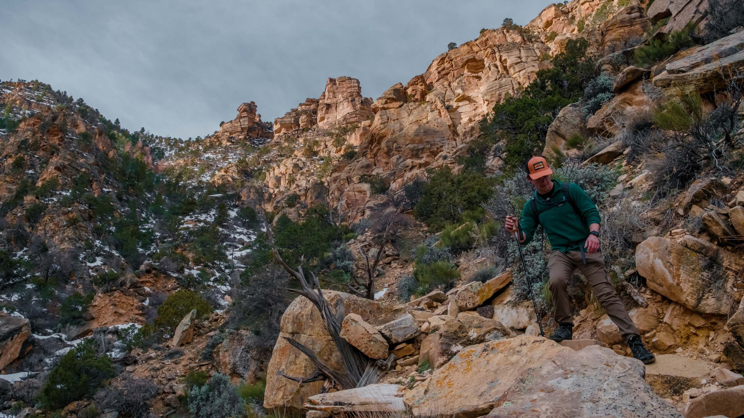 We arose before the Sun and headed into the park, stopping briefly at the trailhead to look down on this somehow more rugged-appearing portion of the canyon. And then, we set off. Our progress was slow at first as we traversed a seemingly endless collection of switchbacks covered by about two feet of snow, being careful not to lose our footing on the slush. Eventually, the snow was behind us and our pace picked up, but just barely. The trail is not well defined in some spots, forcing some time expenditure in route finding. Furthermore, the trail is intermittently covered by grapefruit sized rocks, requiring near constant attention to your footing. In fact, during one of our mid-trail breaks, I gave my attention a break while standing still taking in the views and a minor repositioning of my foot caused me to awkwardly step on a perfectly positioned rock and roll my ankle. This anterior talofibular ligament sprain reared its head a few times throughout this hike in the form of searing pain and unexpected collapses, and I’ve been dealing with the residual instability ever since.