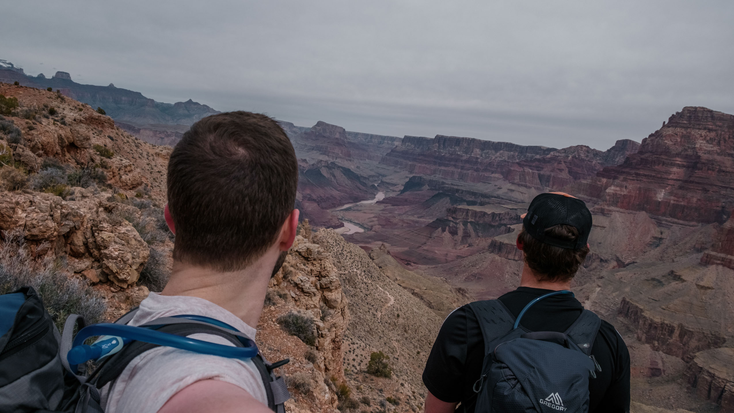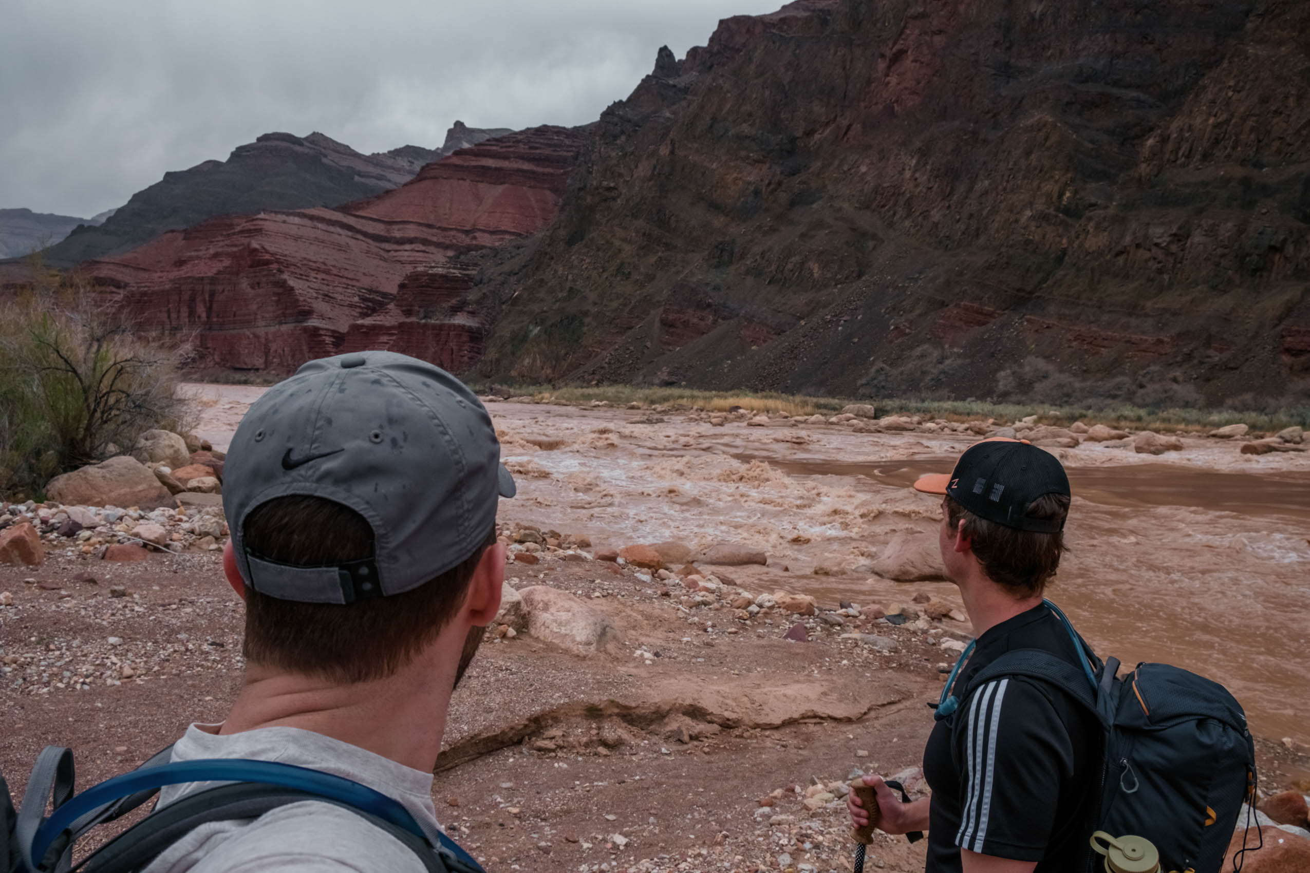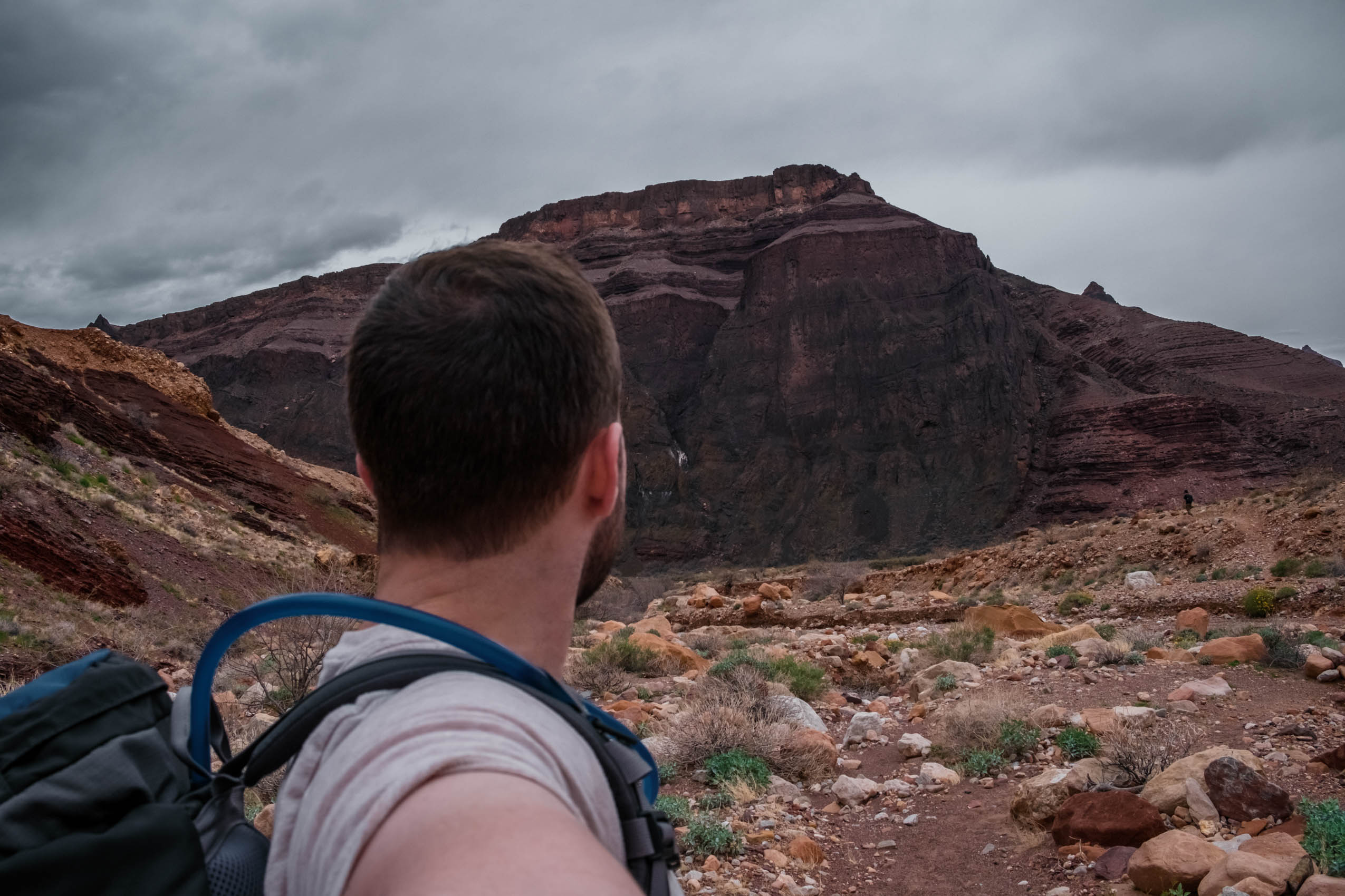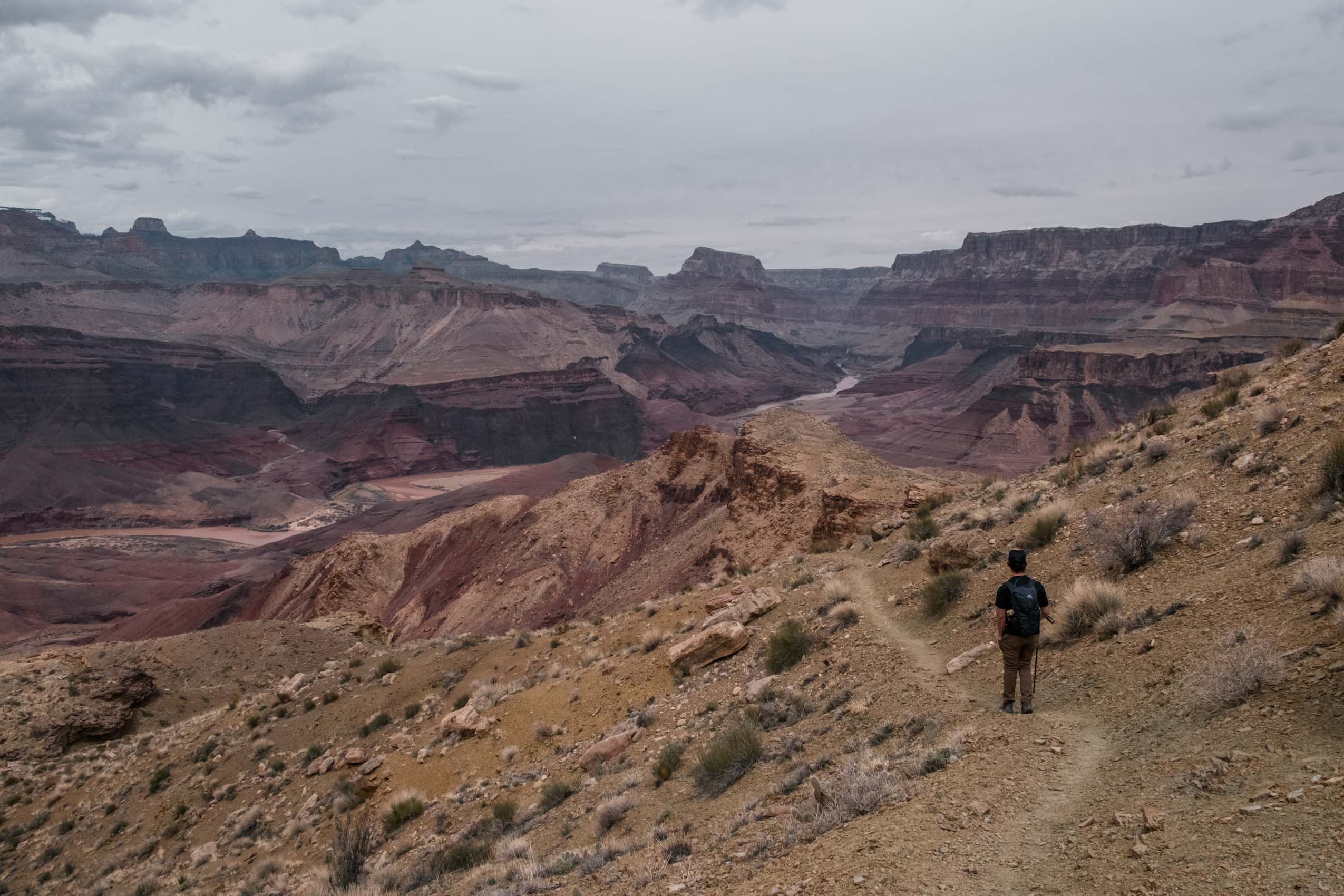 The next few hours of hiking could be summed up as a constant descent down intermittently sketchy terrain broken by absolutely stunning views of this rarely traveled portion of the canyon. Our progress had been slower than expected. It seemed that every fifteen minutes we’d readjust our expected arrival time back at the South Rim later and later. At one point we almost decided to turn back so we weren’t hiking up the most treacherous sections of trail in the dark, but the pull of the river got the best of us and we continued further down. We eventually reached the river at around 2:30pm after hiking for seven hours. If we spent just a half hour admiring the beauty at the bottom before turning back, we’d reach the trailhead at 10pm assuming we kept the same pace going up as we had going down. Of course, that wouldn’t happen. So, we let go of all expectations and adopted a mindset of indifference. We’d move as safely as we could back toward the rim, letting the journey take as long as it did.