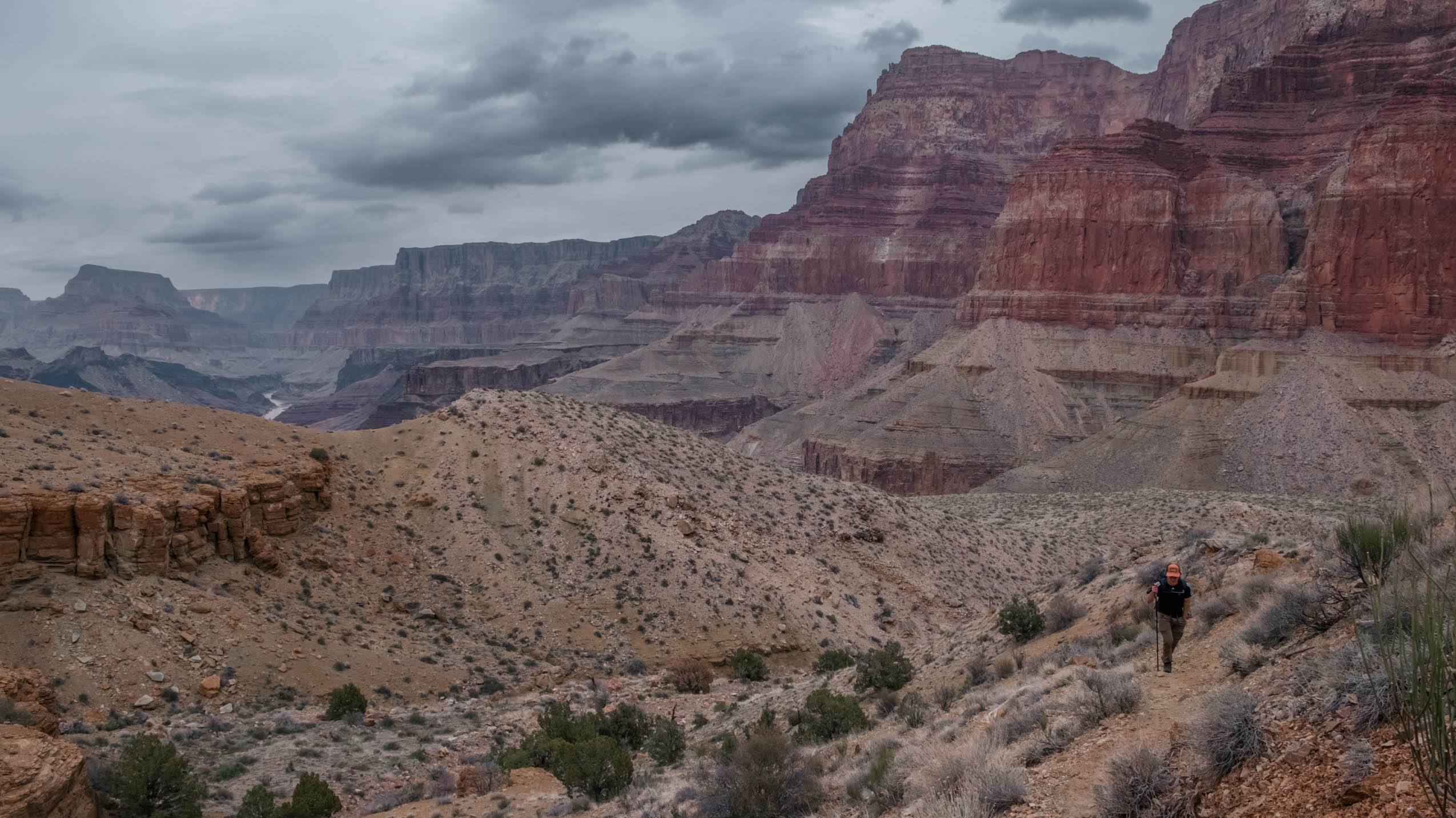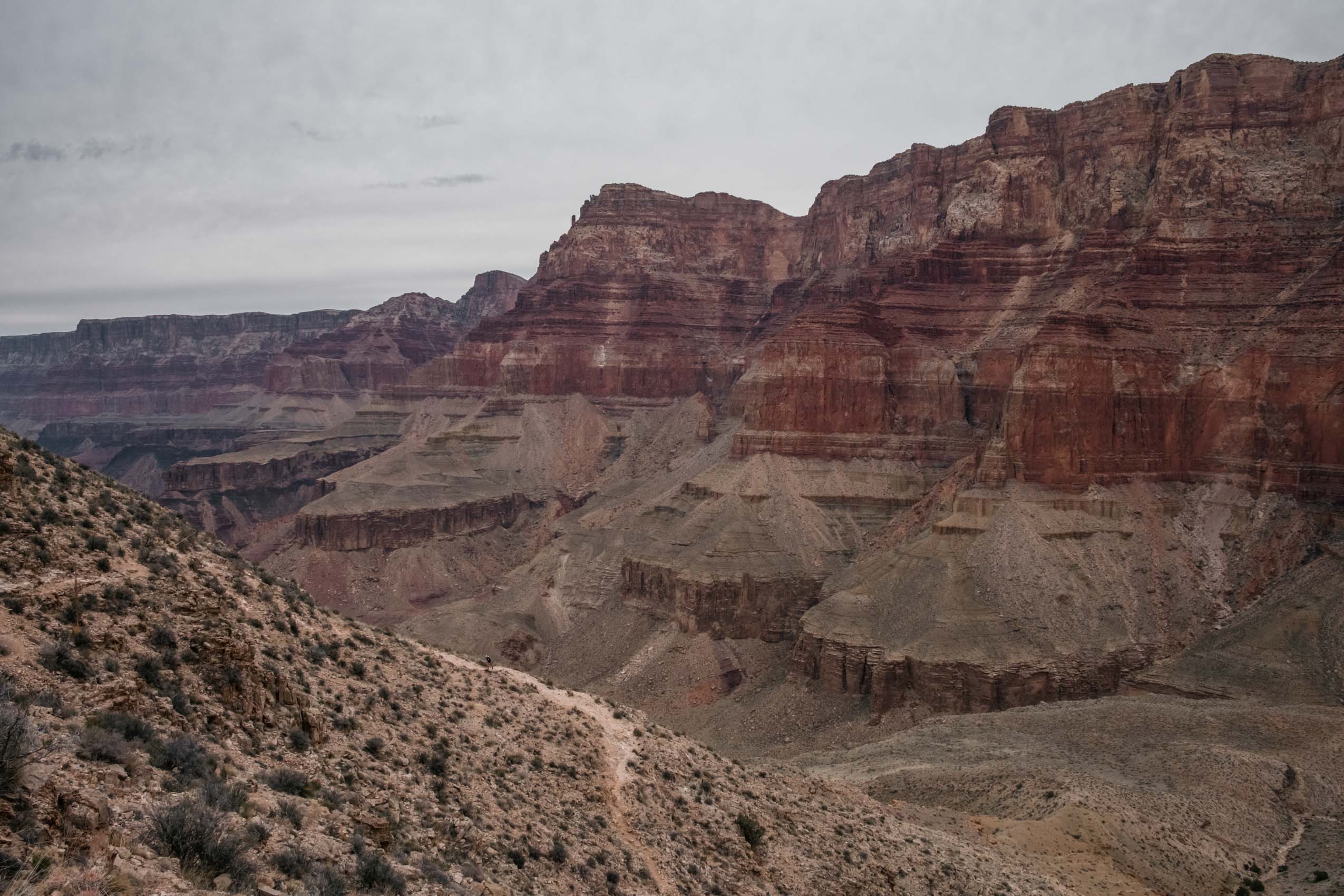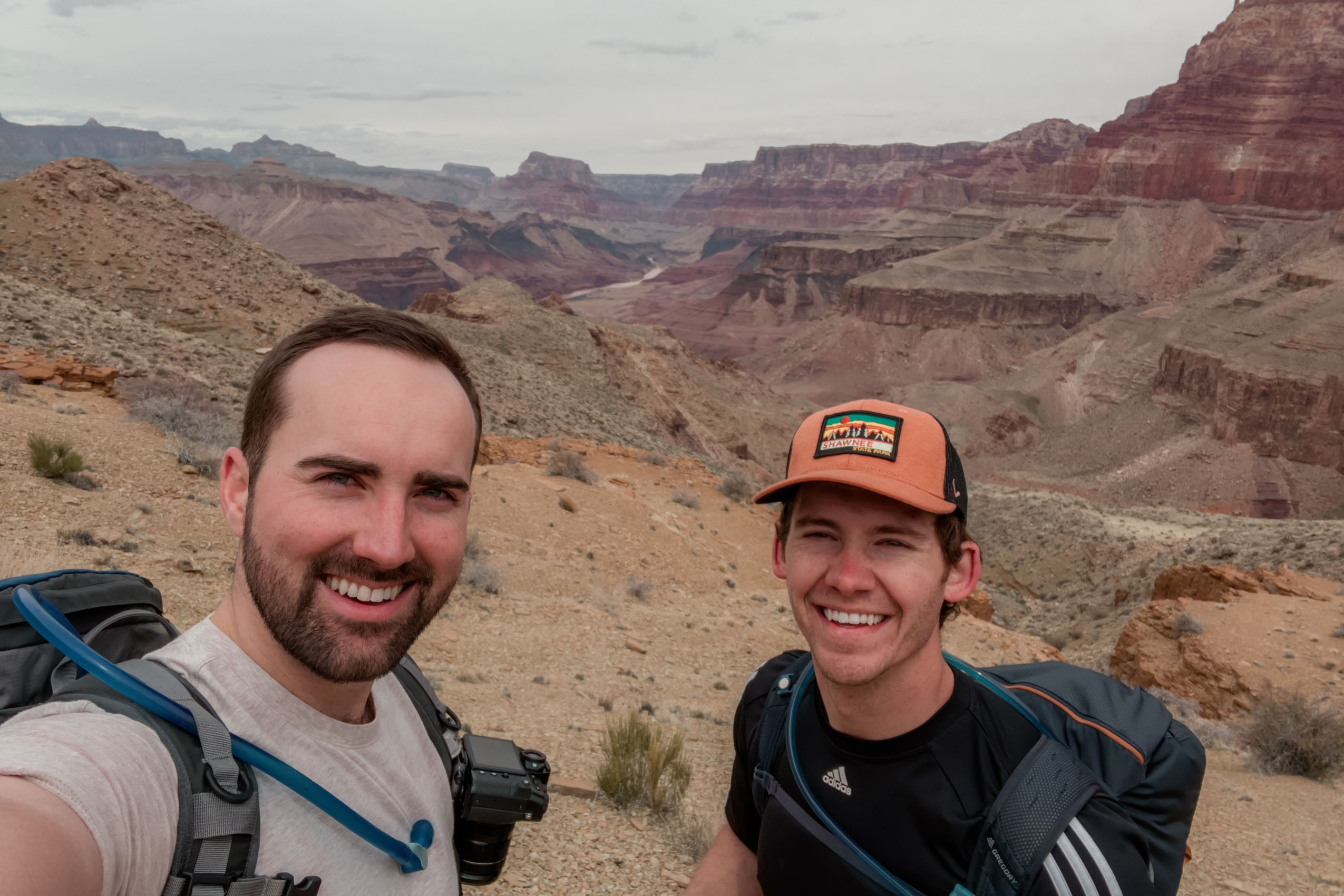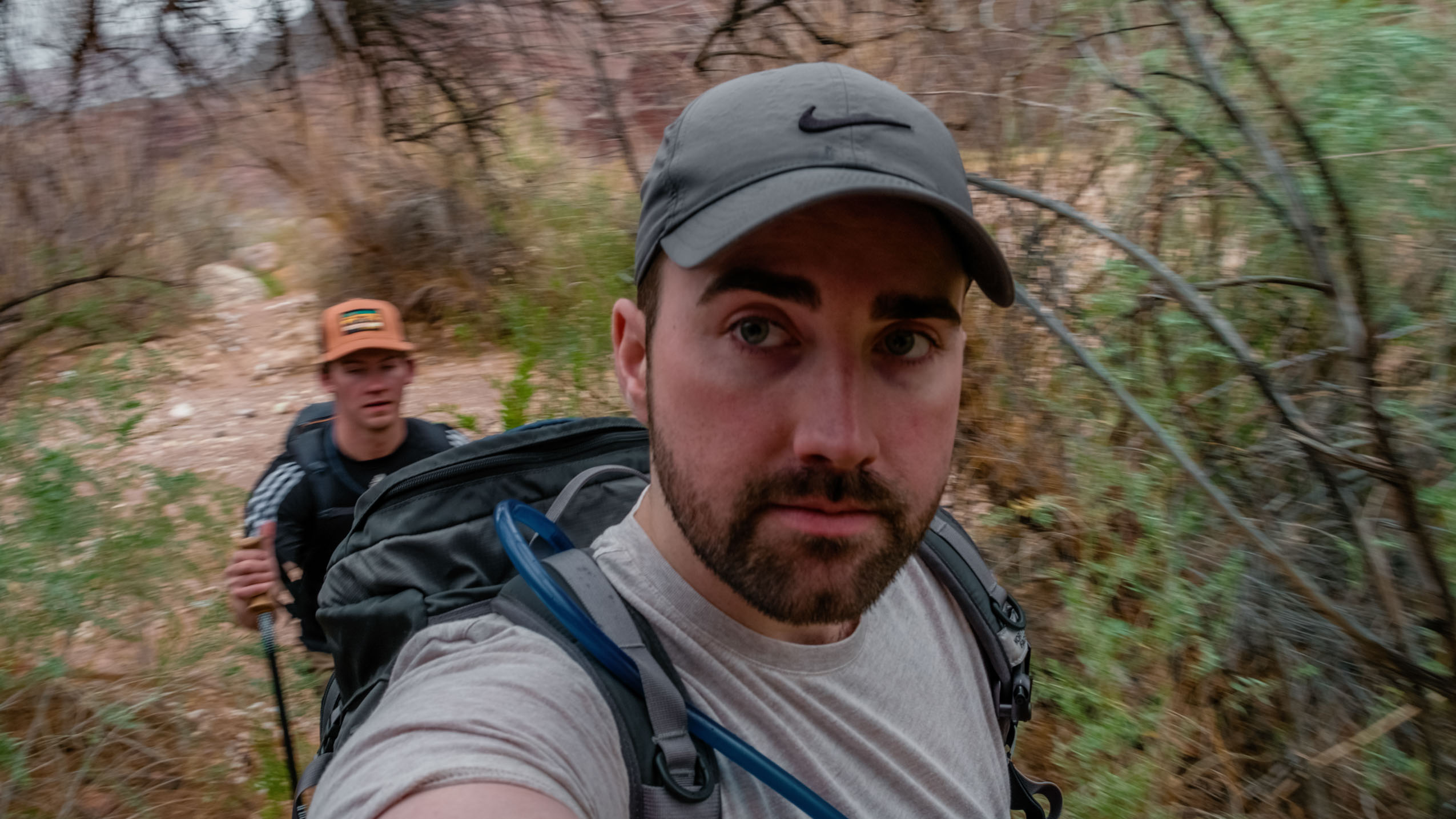 The next few hours of hiking could be summed up as a constant descent down intermittently sketchy terrain broken by absolutely stunning views of this rarely traveled portion of the canyon. Our progress had been slower than expected. It seemed that every fifteen minutes we’d readjust our expected arrival time back at the South Rim later and later. At one point we almost decided to turn back so we weren’t hiking up the most treacherous sections of trail in the dark, but the pull of the river got the best of us and we continued further down. We eventually reached the river at around 2:30pm after hiking for seven hours. If we spent just a half hour admiring the beauty at the bottom before turning back, we’d reach the trailhead at 10pm assuming we kept the same pace going up as we had going down. Of course, that wouldn’t happen. So, we let go of all expectations and adopted a mindset of indifference. We’d move as safely as we could back toward the rim, letting the journey take as long as it did.