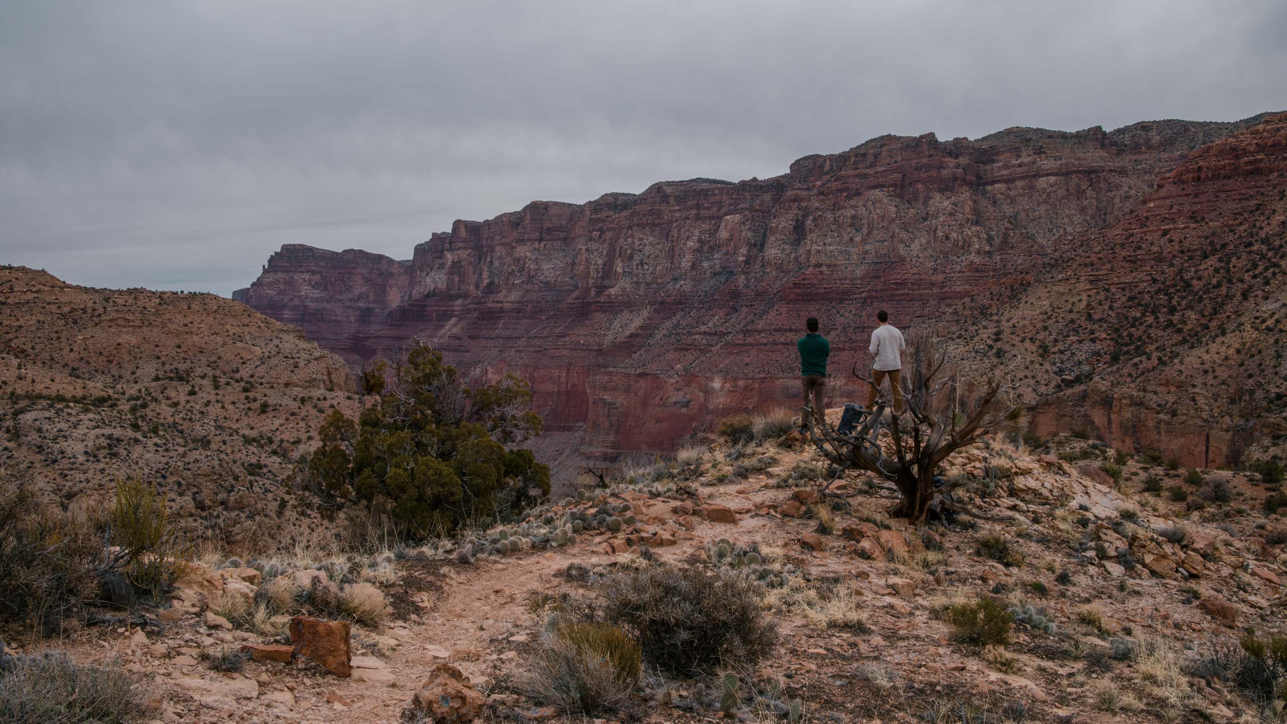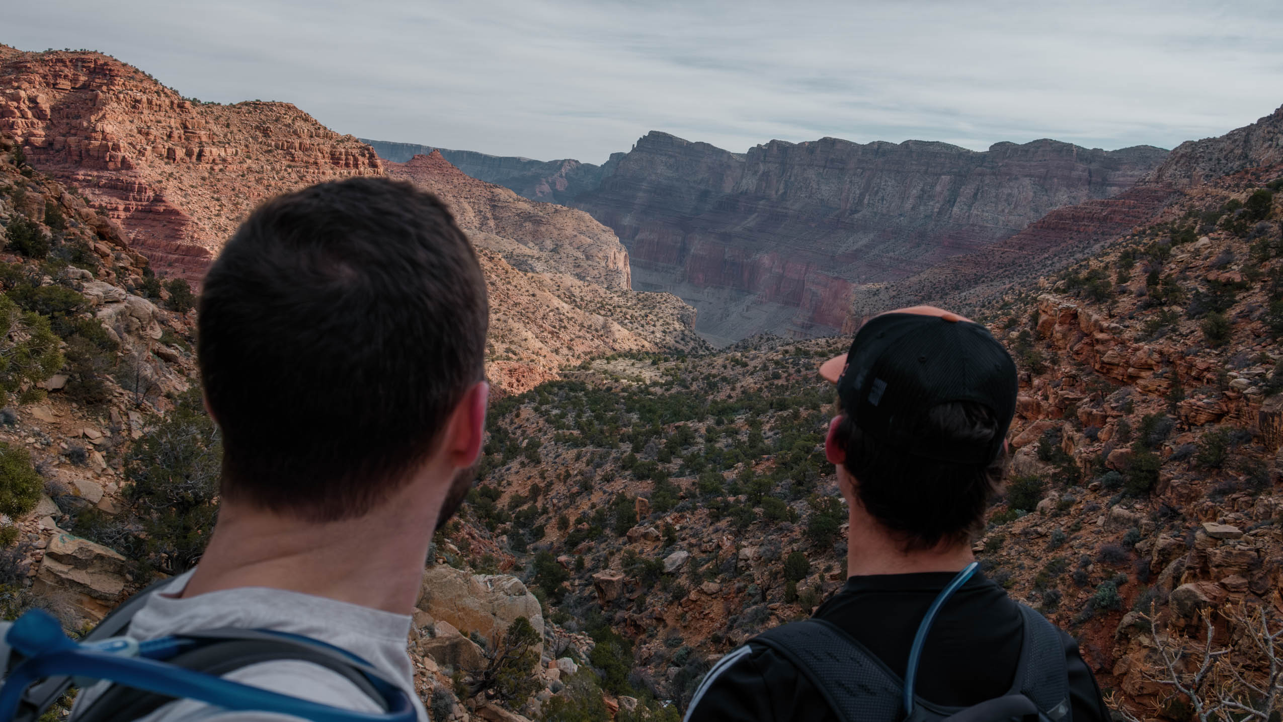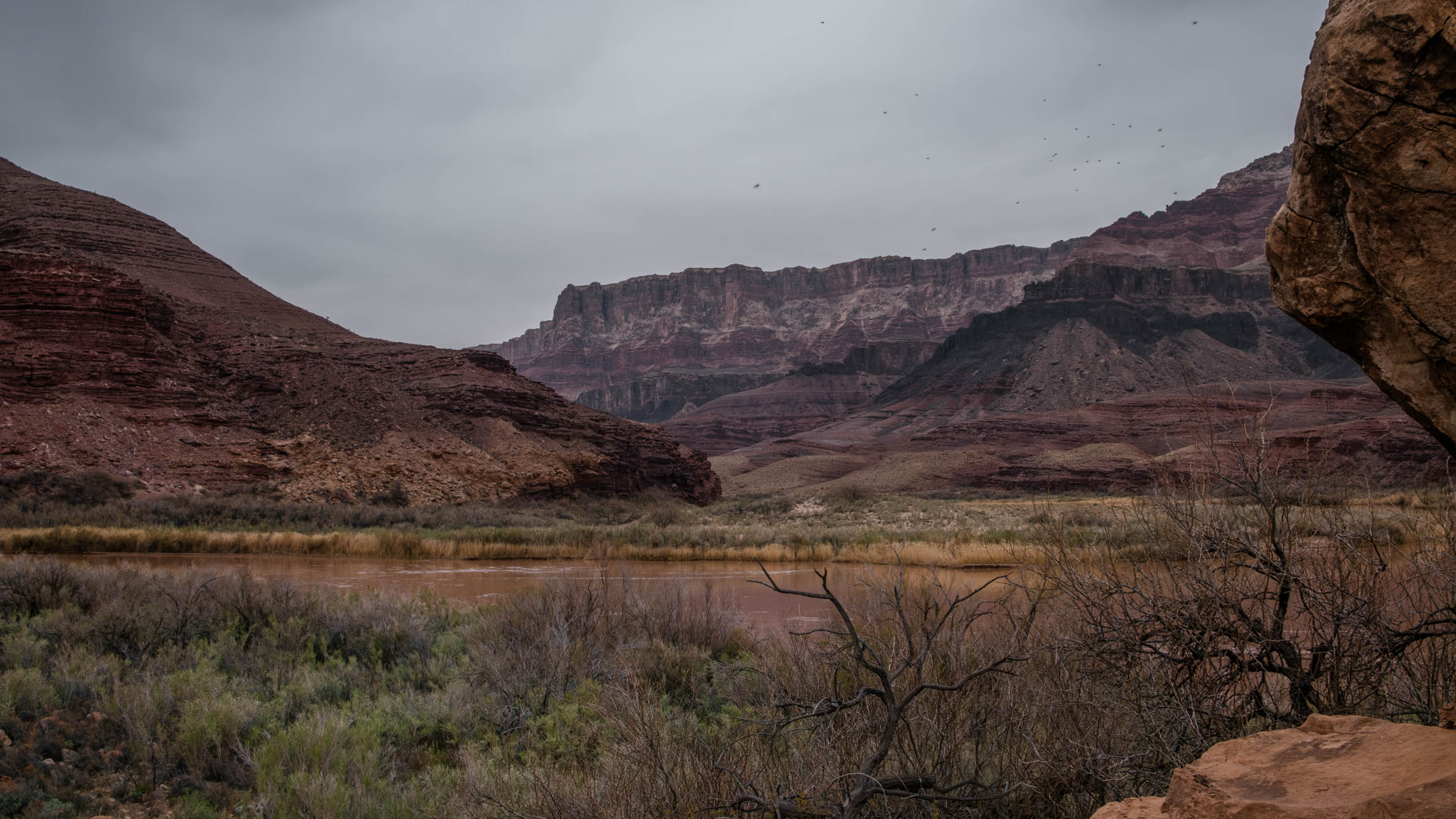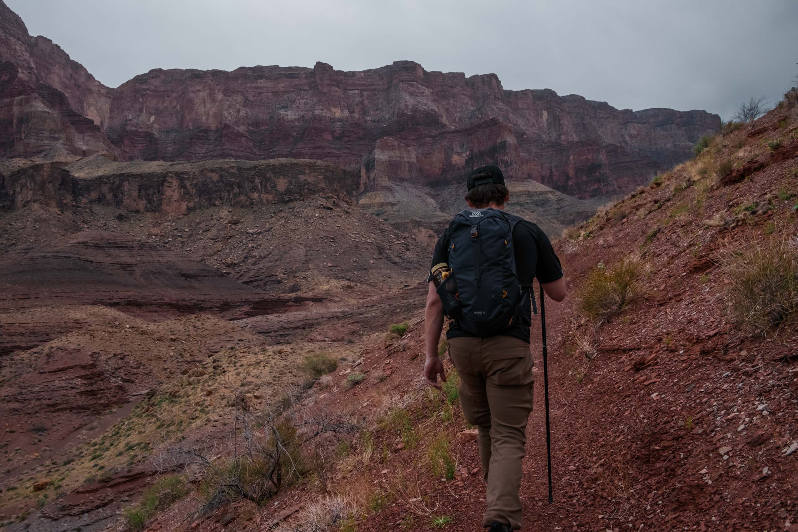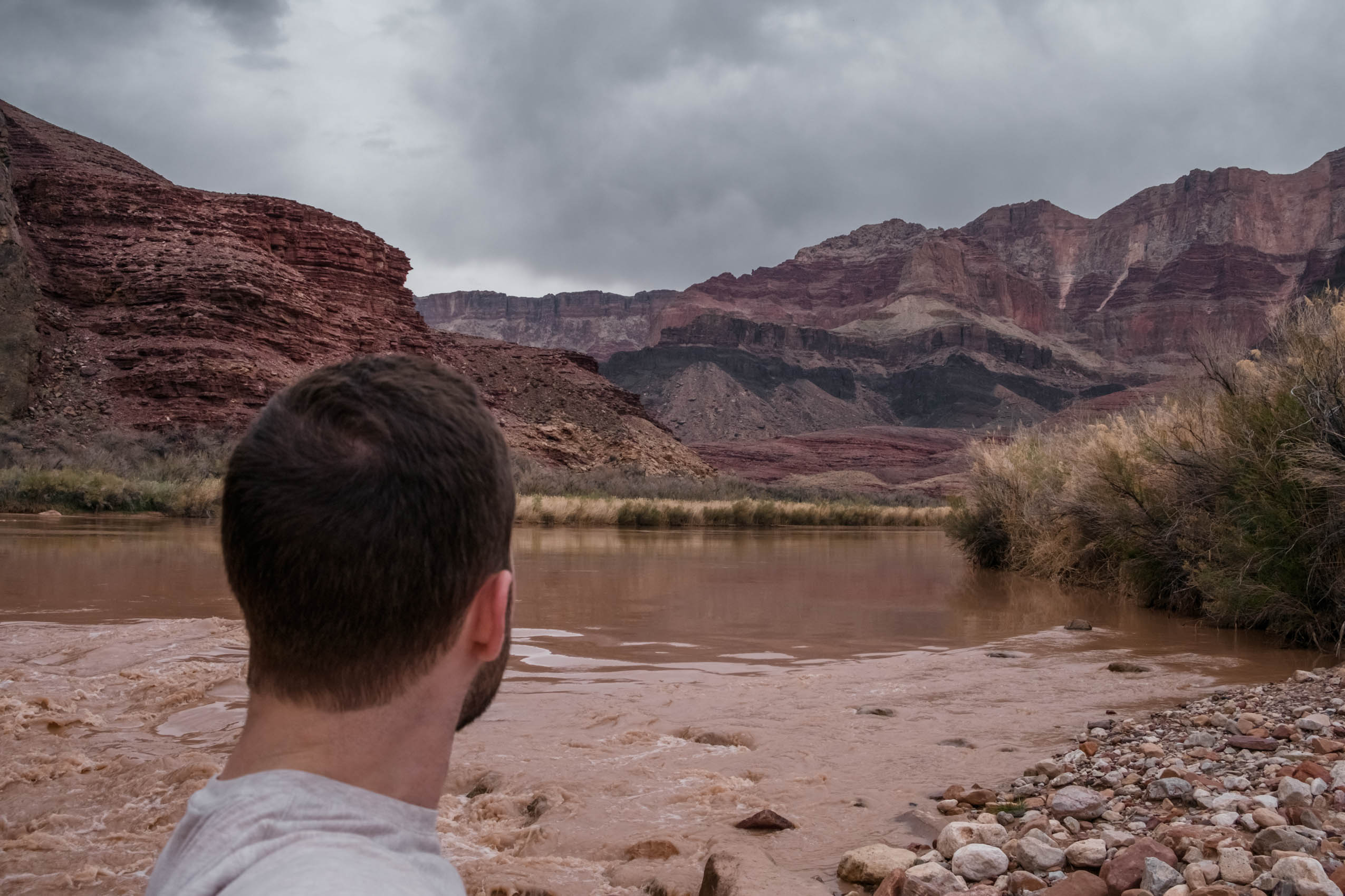 The next few hours of hiking could be summed up as a constant descent down intermittently sketchy terrain broken by absolutely stunning views of this rarely traveled portion of the canyon. Our progress had been slower than expected. It seemed that every fifteen minutes we’d readjust our expected arrival time back at the South Rim later and later. At one point we almost decided to turn back so we weren’t hiking up the most treacherous sections of trail in the dark, but the pull of the river got the best of us and we continued further down. We eventually reached the river at around 2:30pm after hiking for seven hours. If we spent just a half hour admiring the beauty at the bottom before turning back, we’d reach the trailhead at 10pm assuming we kept the same pace going up as we had going down. Of course, that wouldn’t happen. So, we let go of all expectations and adopted a mindset of indifference. We’d move as safely as we could back toward the rim, letting the journey take as long as it did.