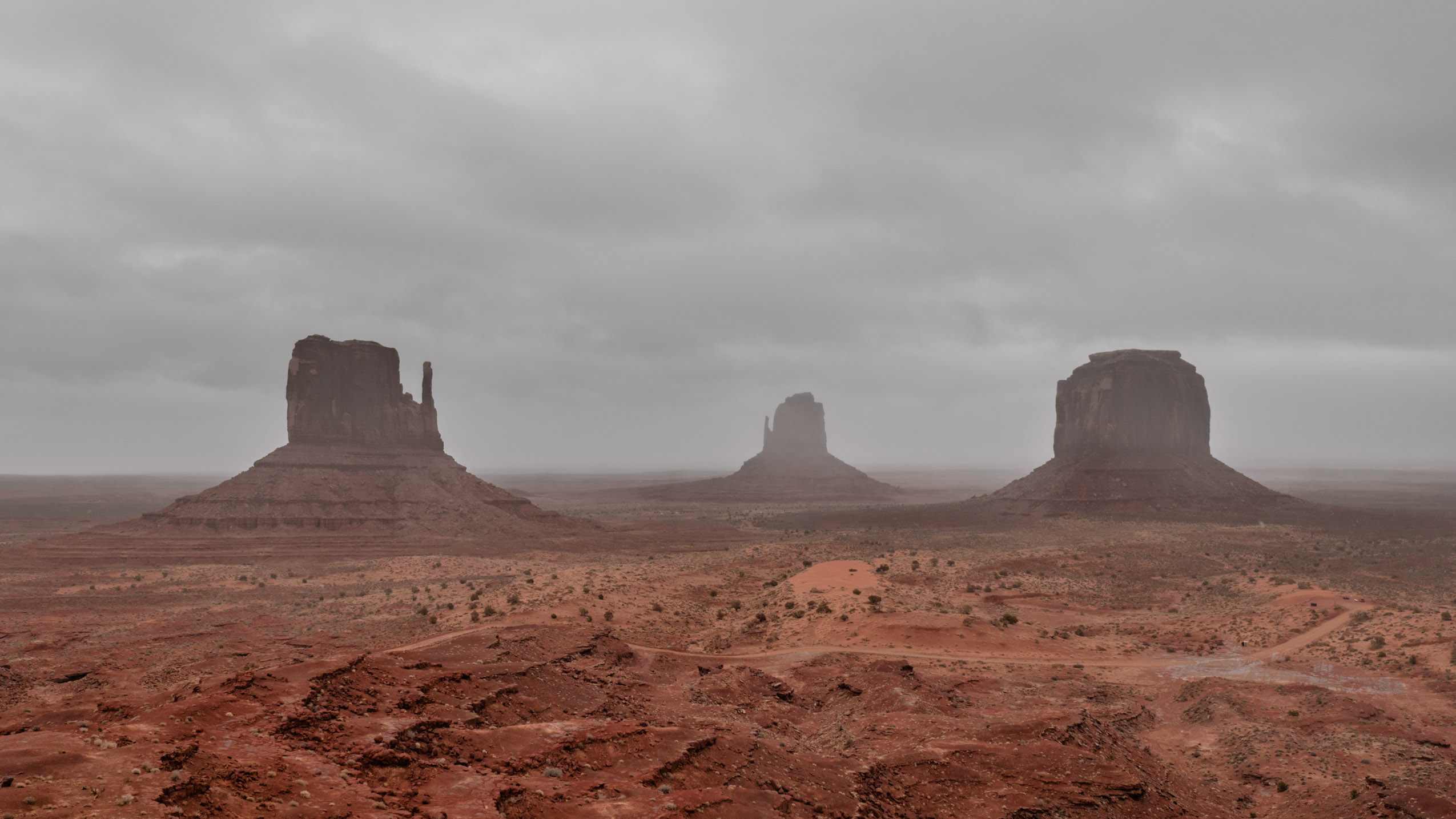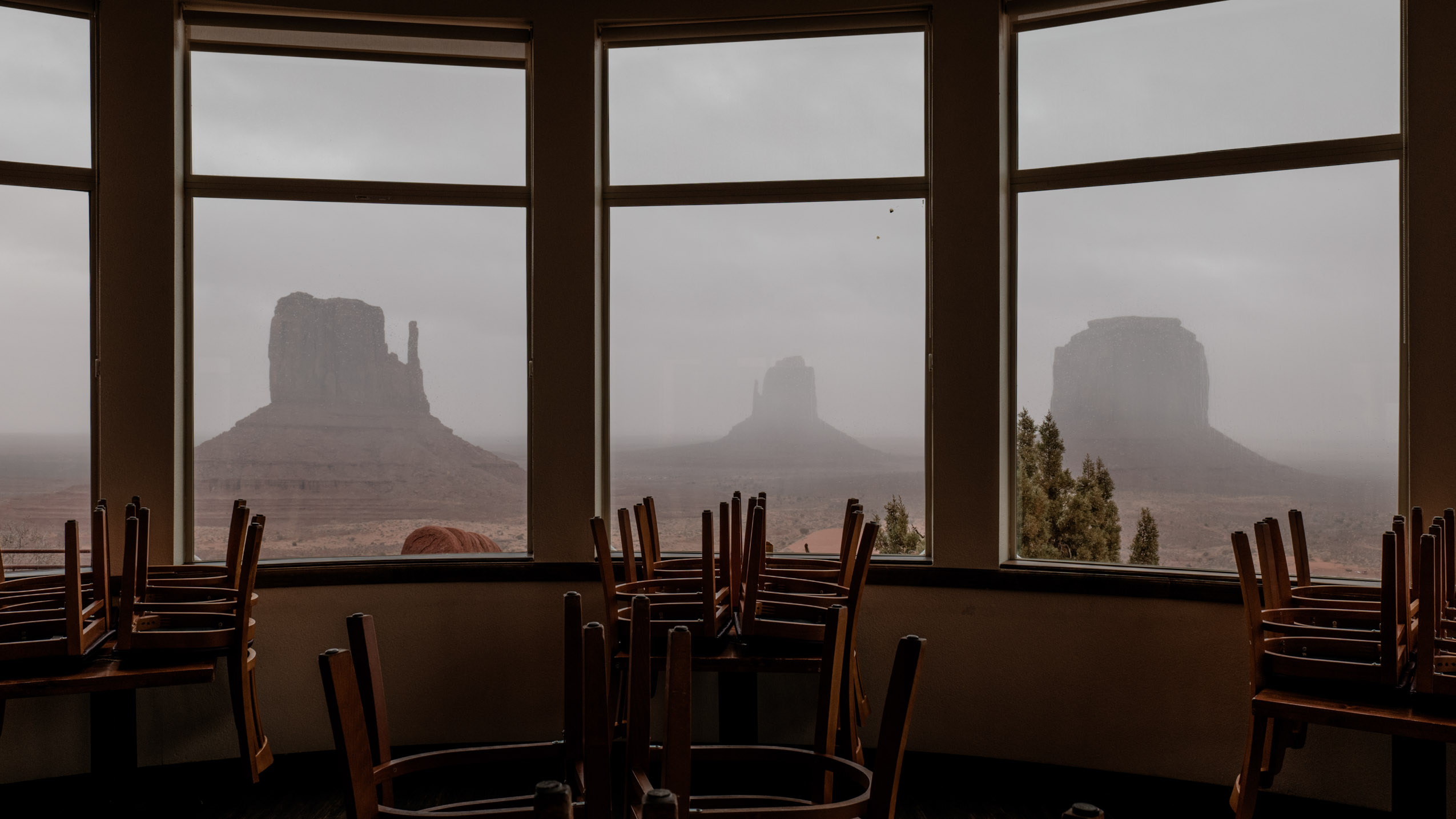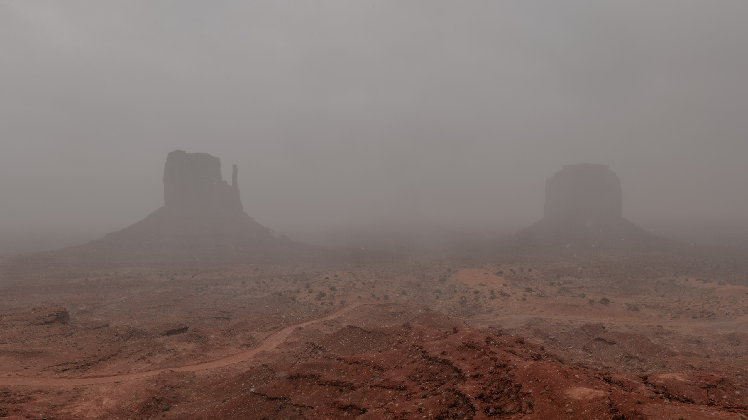 Our drive to Monument Valley was a foggy one; at time I could barely see more than fifty yards in front of me out my windshield. I had hoped that the fog would lift as the Sun got higher in the sky before we arrived at Monument valley, but alas, as we pulled into the visitor area parking lot, I could barely see anything past the visitors center in front of the car. The iconic monolithic rock formations we had come to see were largely masked by fog on the opposite of the visitors center. We went inside and milled around looking at handmade goods and photos on the wall. Gradually, the fog began to lift, and as we spent more time looking we could see more and more of the rock formations we’d come for.