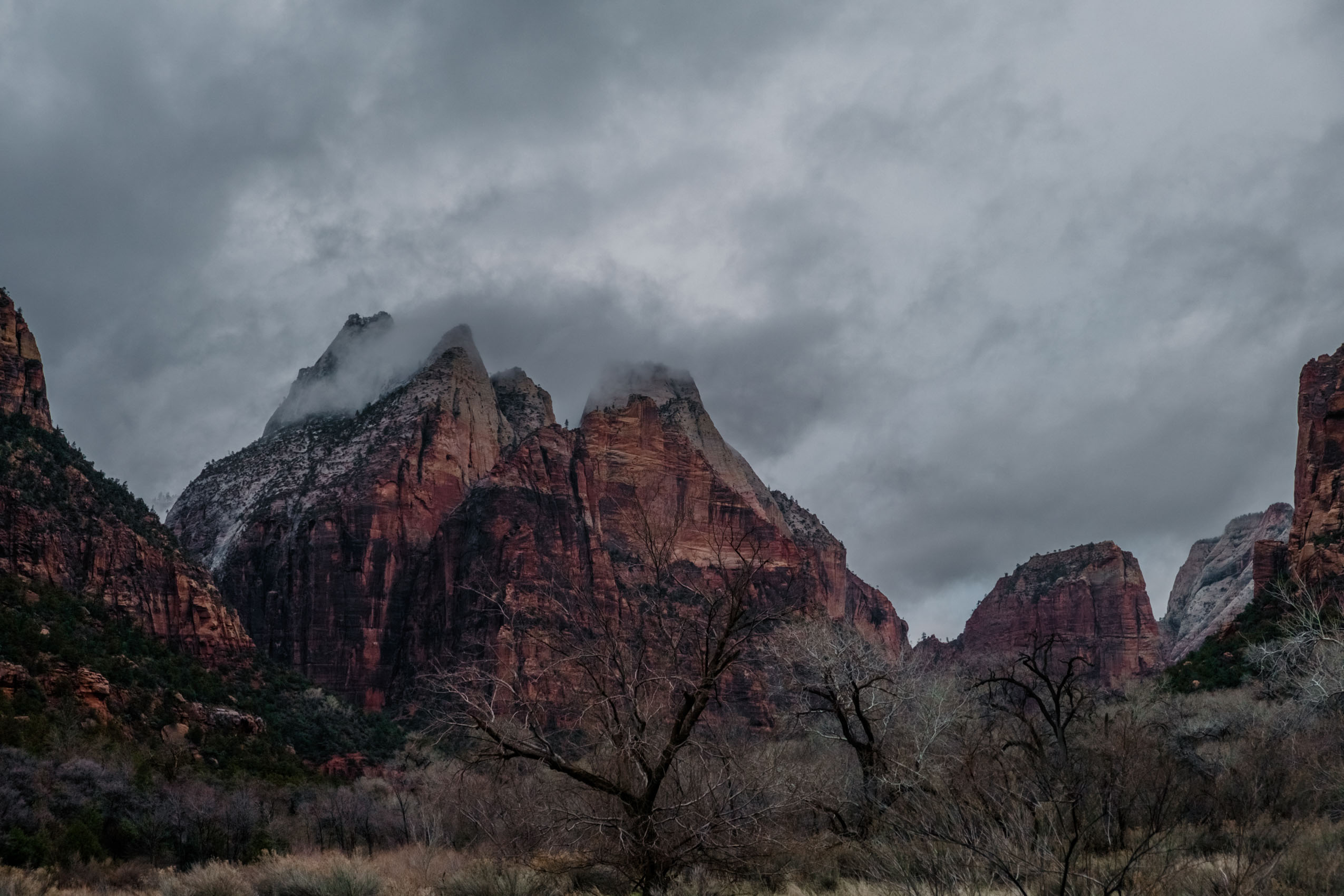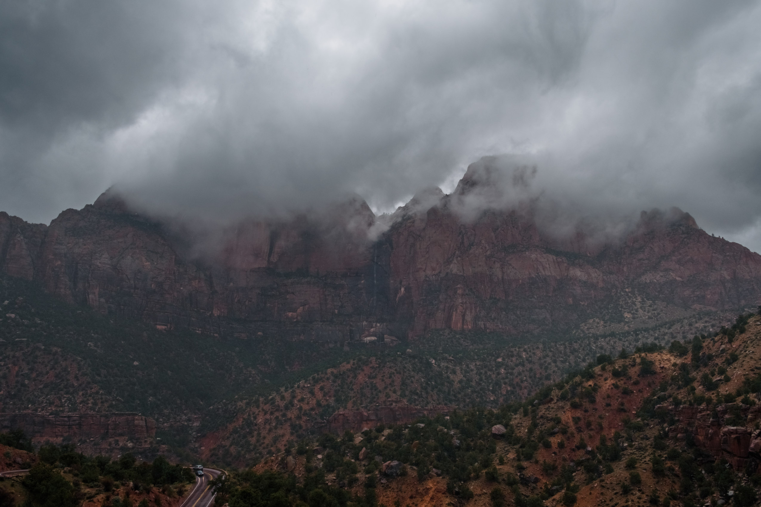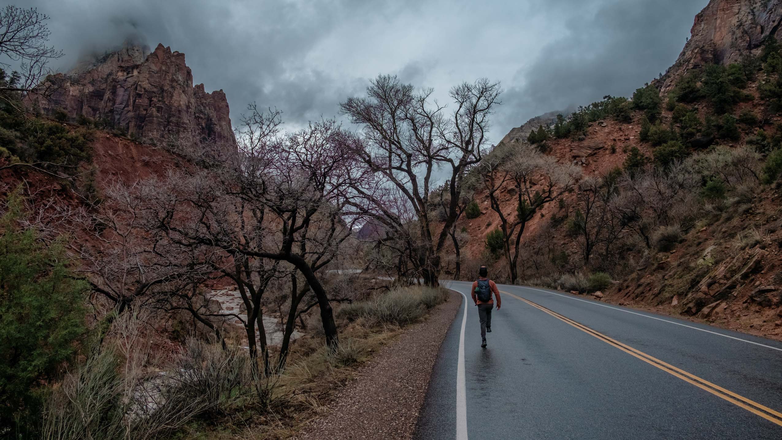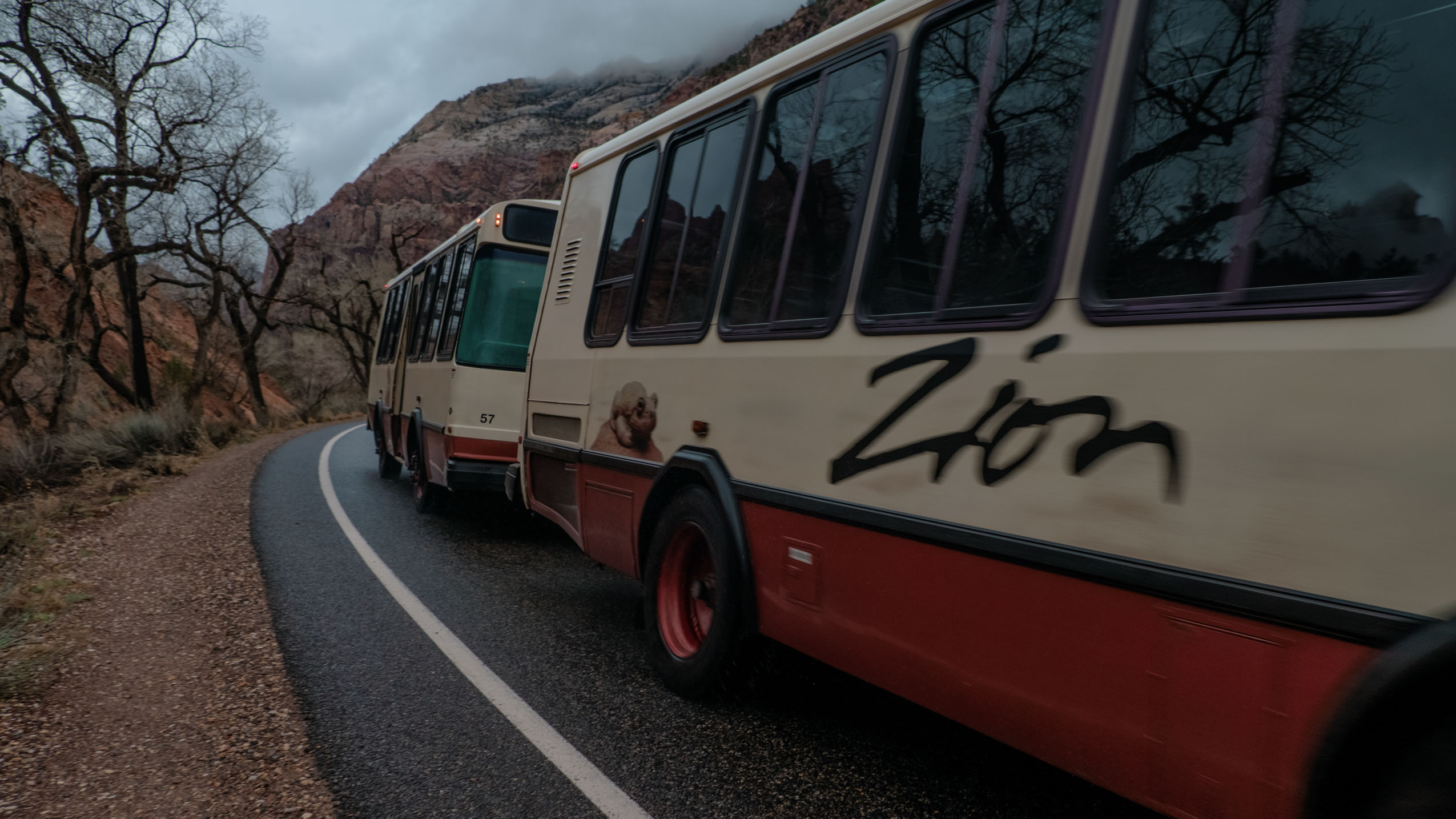 Continuing on from Page, AZ, we stopped for lunch at the famous Thunderbird restaurant in Mount Carmel Junction. This little restaurant holds a special place in my heart, as described in From Tucson to Salt Lake City, and Weekending in Bryce Canyon. And with our stomachs full, we continued into Zion National Park. Throughout our drive we’d encountered more of the same rain and thunderstorms we’d encountered the previous day hiking the Tanner Trail, and the dark clouds showed no sign of letting up as we drove the winding road down from the Zion-Mount Carmel Tunnel. After parking at the visitors center, instead of riding the famous Zion shuttle, we opted to set out on foot to immerse ourselves in the park’s beauty at a slower pace. After yesterday, the flat, easy walk was welcome and allowed us to adopt a relaxed pace. We meandered along the Virgin River that flows through the center of the park for as long as the terrain would allow, and then continued deeper into the park along the road with plans to simply catch one of the last shuttles back to the parking lot when we were done exploring. As the scheduled time of the last shuttle neared, we headed back to one of the shuttle stops. We were several hundred yards away when we looked over our shoulders and saw the shuttle rapidly approaching. This sent us sprinting down the road, our joints still aching from the day prior, arriving at the shuttle stop just as the bus opened its doors. We climbed on board, rode to the parking lot, and then drove out of the park toward Las Vegas where we’d spend the next few days rejuvenating in man-made luxury.