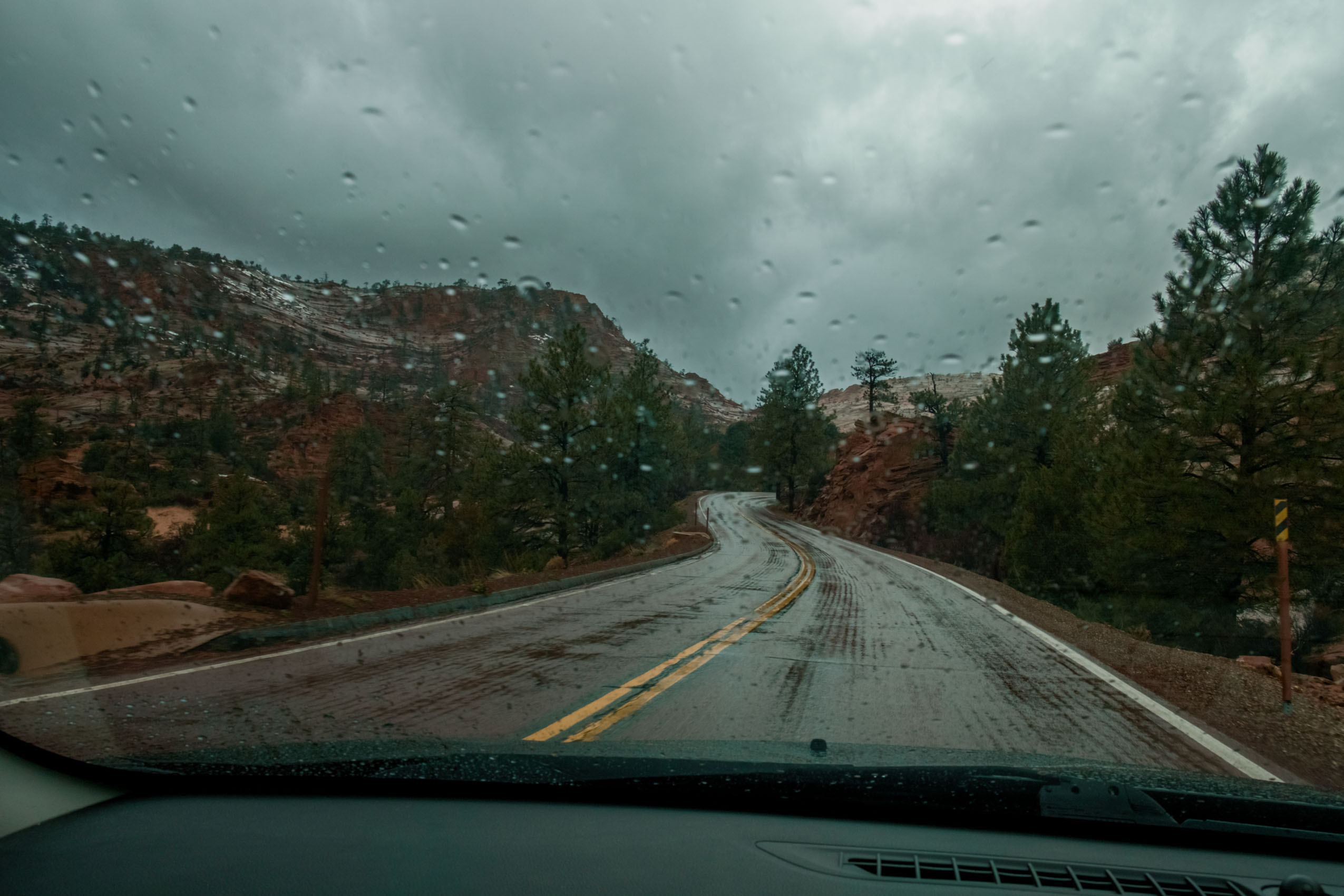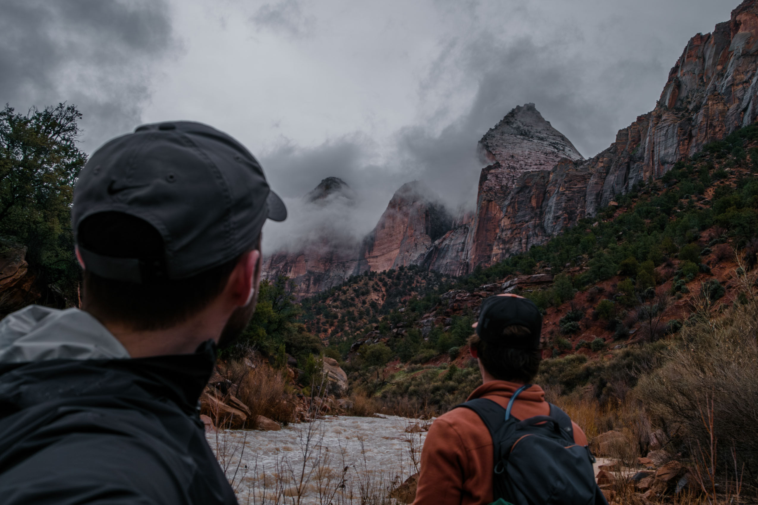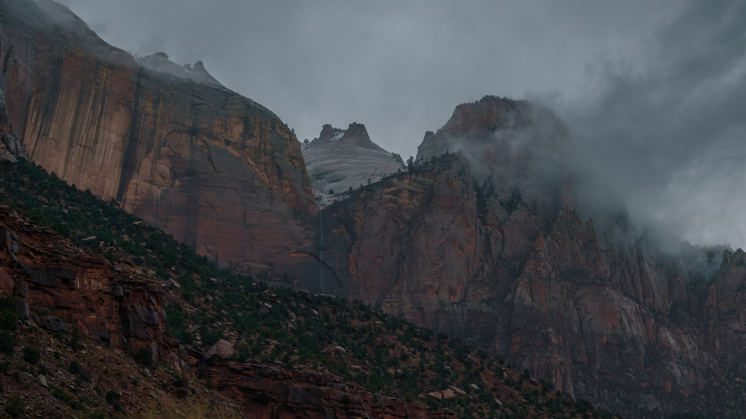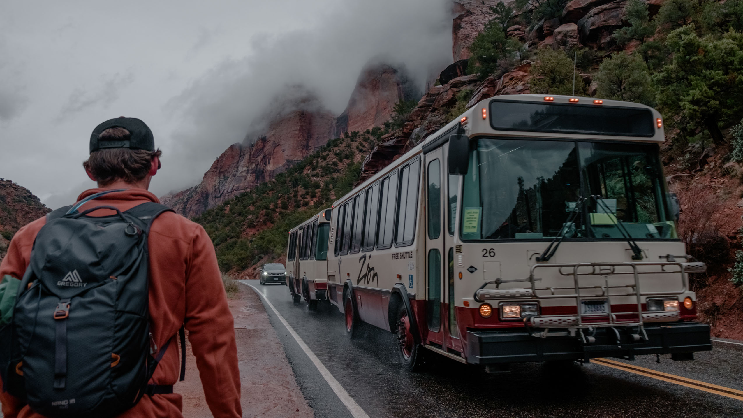 Continuing on from Page, AZ, we stopped for lunch at the famous Thunderbird restaurant in Mount Carmel Junction. This little restaurant holds a special place in my heart, as described in From Tucson to Salt Lake City, and Weekending in Bryce Canyon. And with our stomachs full, we continued into Zion National Park. Throughout our drive we’d encountered more of the same rain and thunderstorms we’d encountered the previous day hiking the Tanner Trail, and the dark clouds showed no sign of letting up as we drove the winding road down from the Zion-Mount Carmel Tunnel. After parking at the visitors center, instead of riding the famous Zion shuttle, we opted to set out on foot to immerse ourselves in the park’s beauty at a slower pace. After yesterday, the flat, easy walk was welcome and allowed us to adopt a relaxed pace. We meandered along the Virgin River that flows through the center of the park for as long as the terrain would allow, and then continued deeper into the park along the road with plans to simply catch one of the last shuttles back to the parking lot when we were done exploring. As the scheduled time of the last shuttle neared, we headed back to one of the shuttle stops. We were several hundred yards away when we looked over our shoulders and saw the shuttle rapidly approaching. This sent us sprinting down the road, our joints still aching from the day prior, arriving at the shuttle stop just as the bus opened its doors. We climbed on board, rode to the parking lot, and then drove out of the park toward Las Vegas where we’d spend the next few days rejuvenating in man-made luxury.