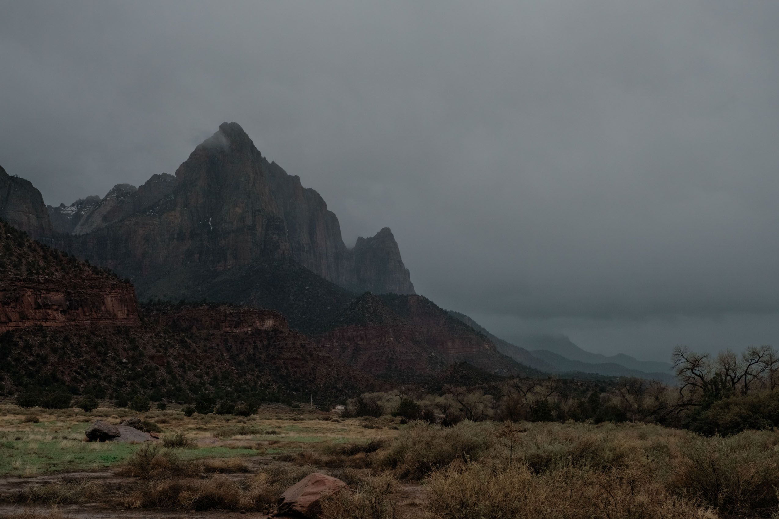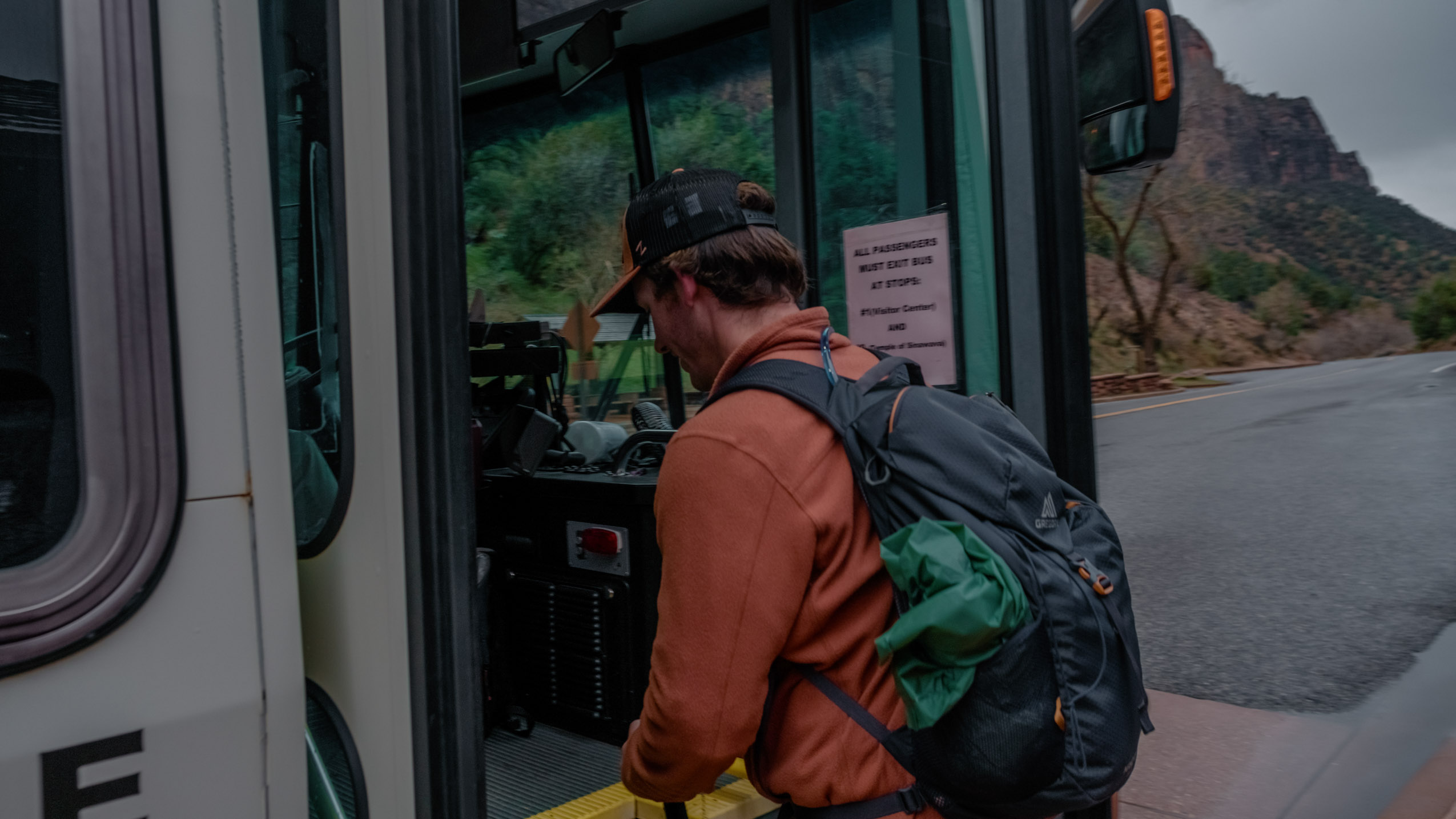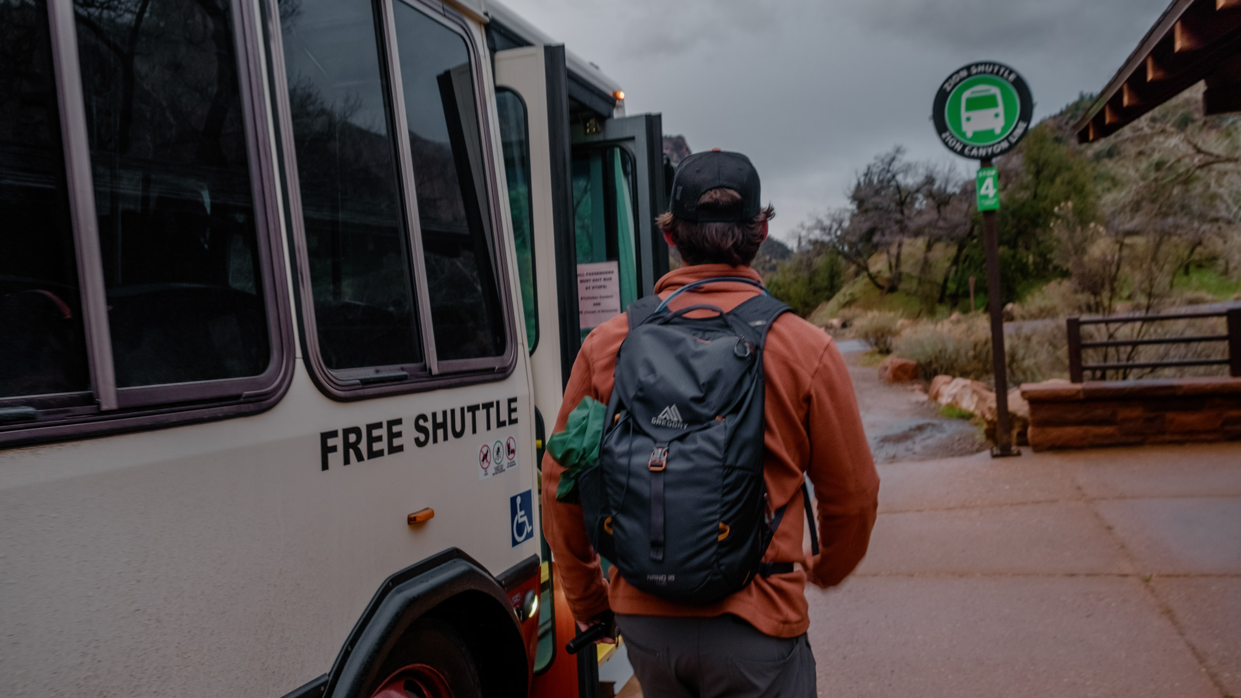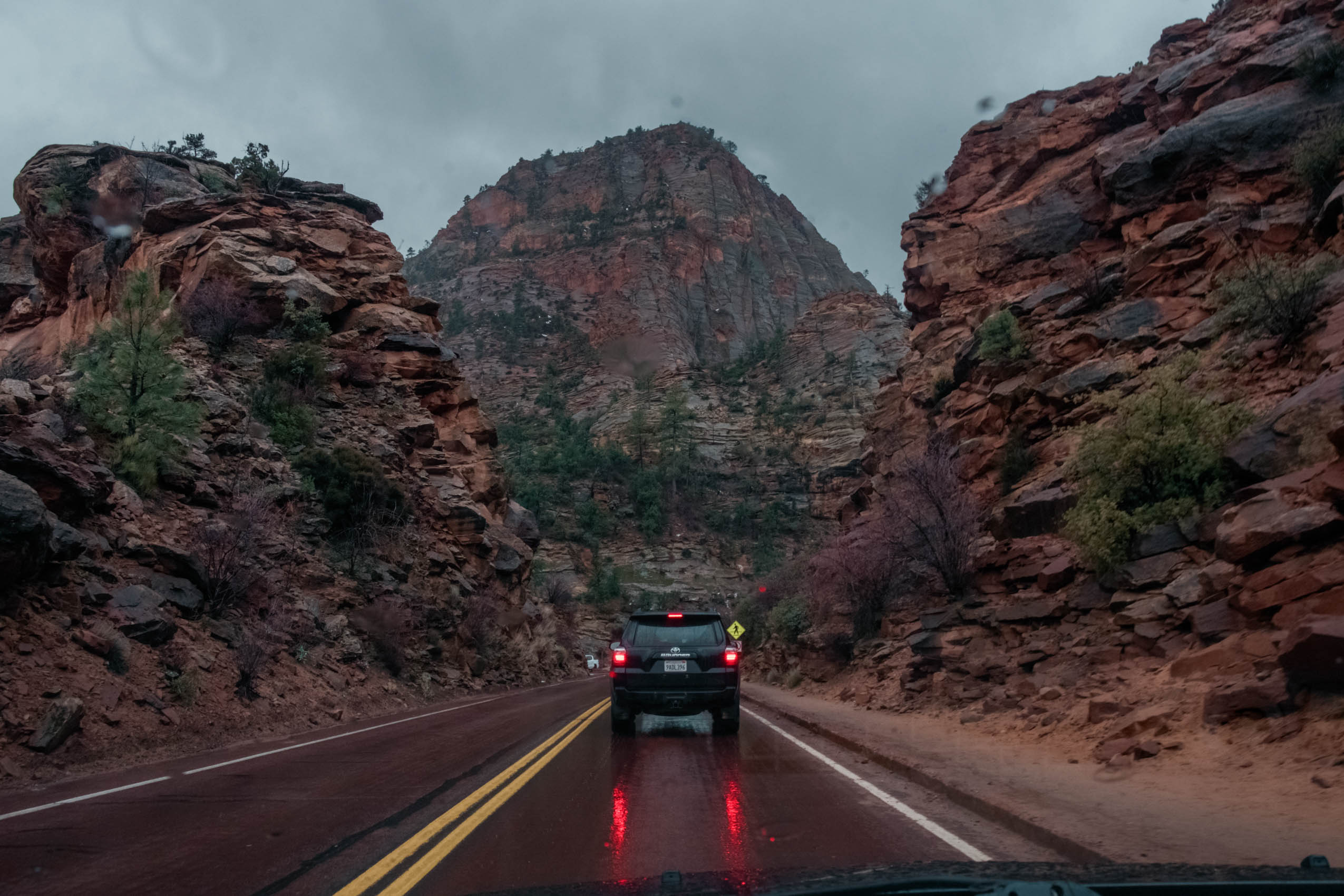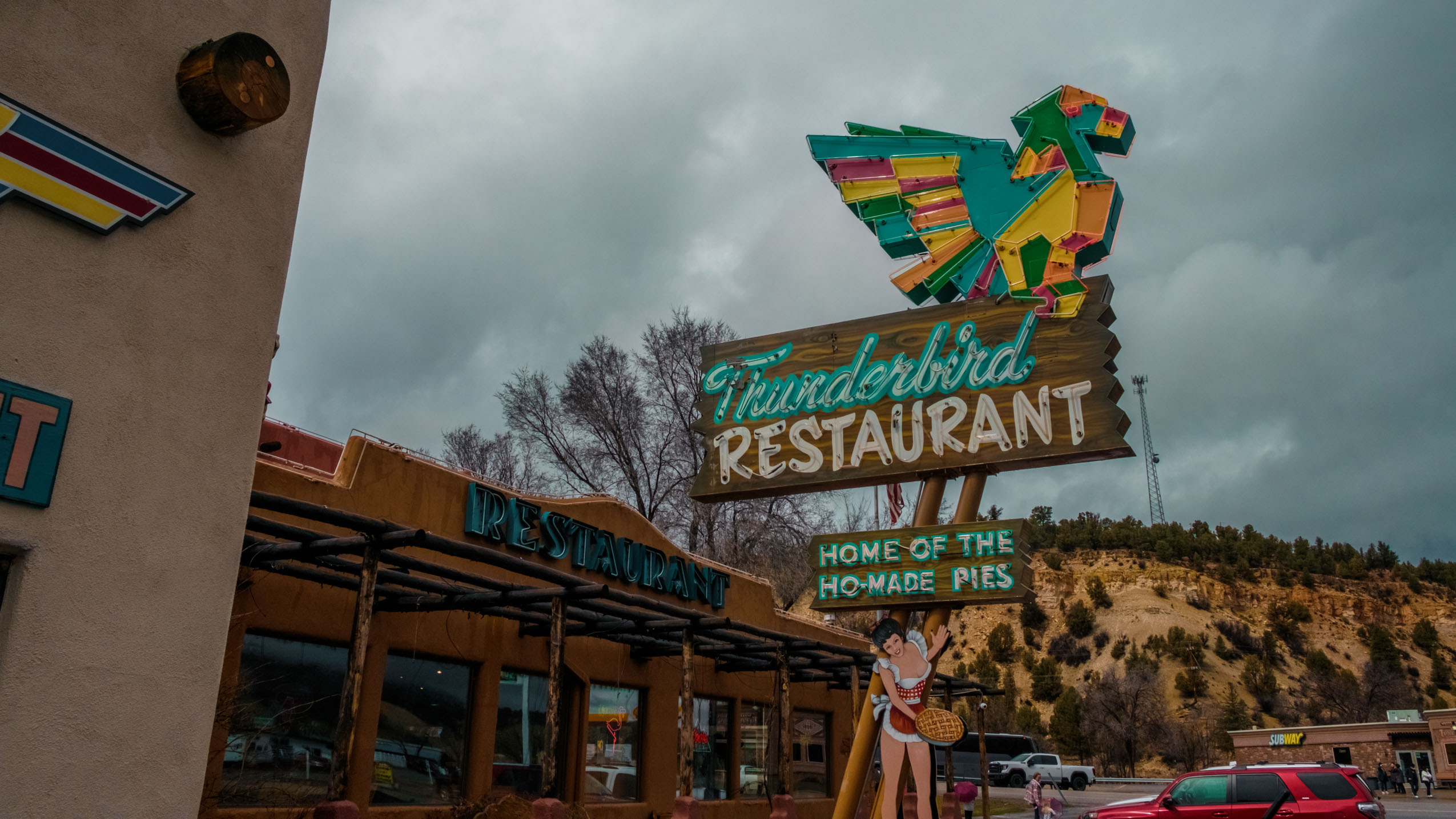 Continuing on from Page, AZ, we stopped for lunch at the famous Thunderbird restaurant in Mount Carmel Junction. This little restaurant holds a special place in my heart, as described in From Tucson to Salt Lake City, and Weekending in Bryce Canyon. And with our stomachs full, we continued into Zion National Park. Throughout our drive we’d encountered more of the same rain and thunderstorms we’d encountered the previous day hiking the Tanner Trail, and the dark clouds showed no sign of letting up as we drove the winding road down from the Zion-Mount Carmel Tunnel. After parking at the visitors center, instead of riding the famous Zion shuttle, we opted to set out on foot to immerse ourselves in the park’s beauty at a slower pace. After yesterday, the flat, easy walk was welcome and allowed us to adopt a relaxed pace. We meandered along the Virgin River that flows through the center of the park for as long as the terrain would allow, and then continued deeper into the park along the road with plans to simply catch one of the last shuttles back to the parking lot when we were done exploring. As the scheduled time of the last shuttle neared, we headed back to one of the shuttle stops. We were several hundred yards away when we looked over our shoulders and saw the shuttle rapidly approaching. This sent us sprinting down the road, our joints still aching from the day prior, arriving at the shuttle stop just as the bus opened its doors. We climbed on board, rode to the parking lot, and then drove out of the park toward Las Vegas where we’d spend the next few days rejuvenating in man-made luxury.