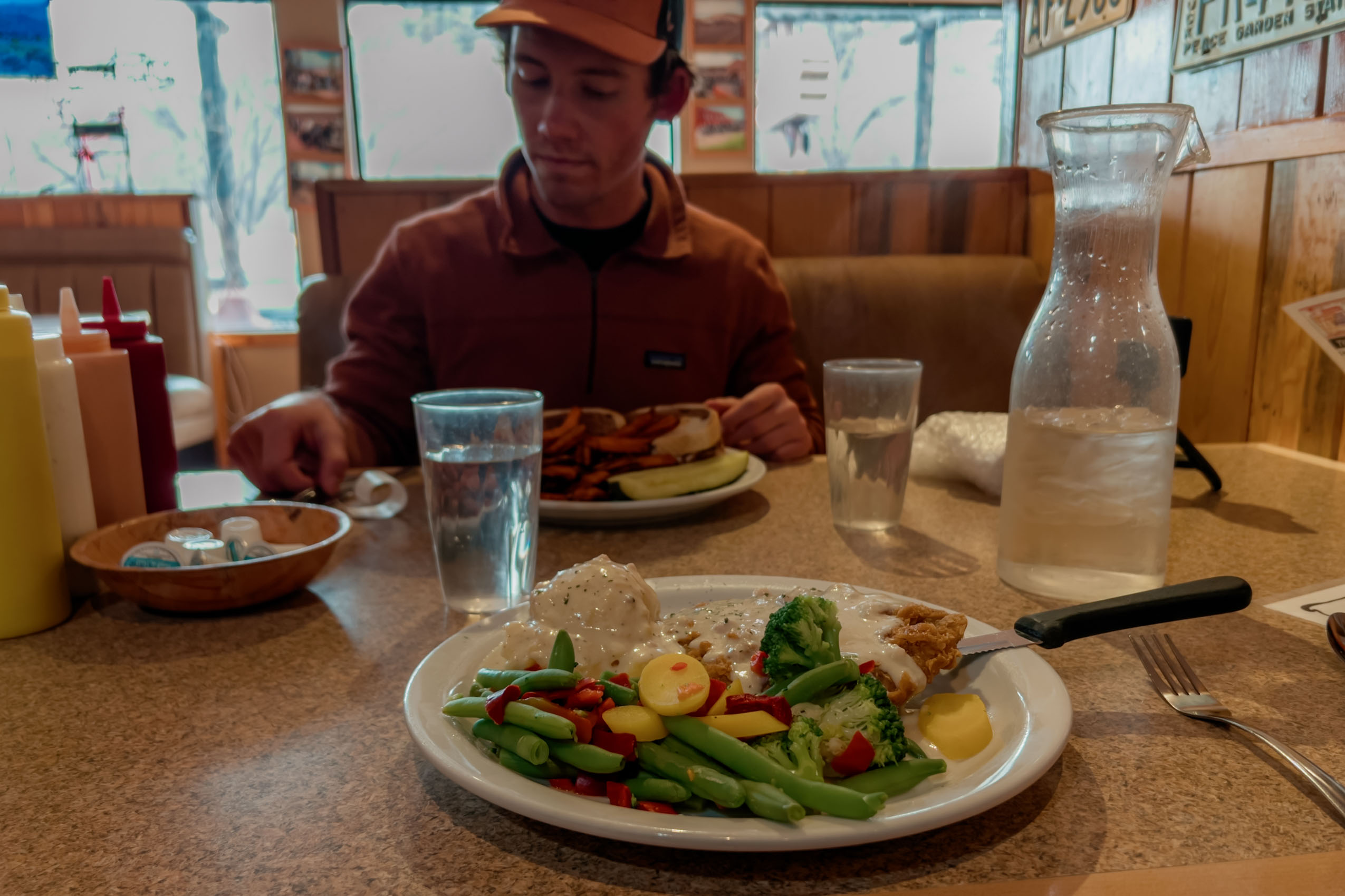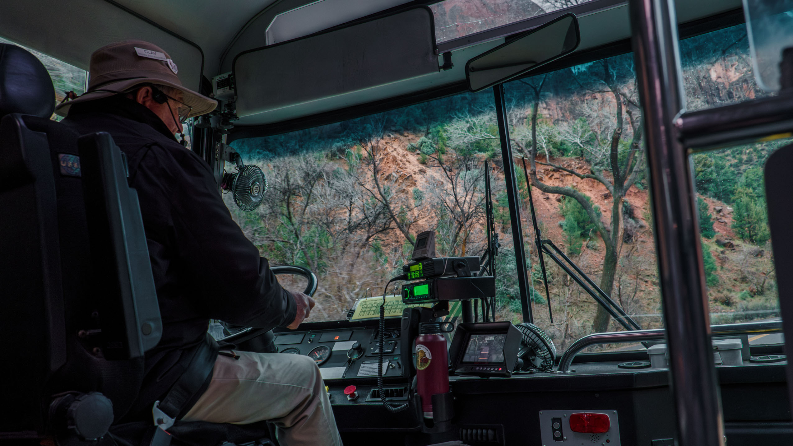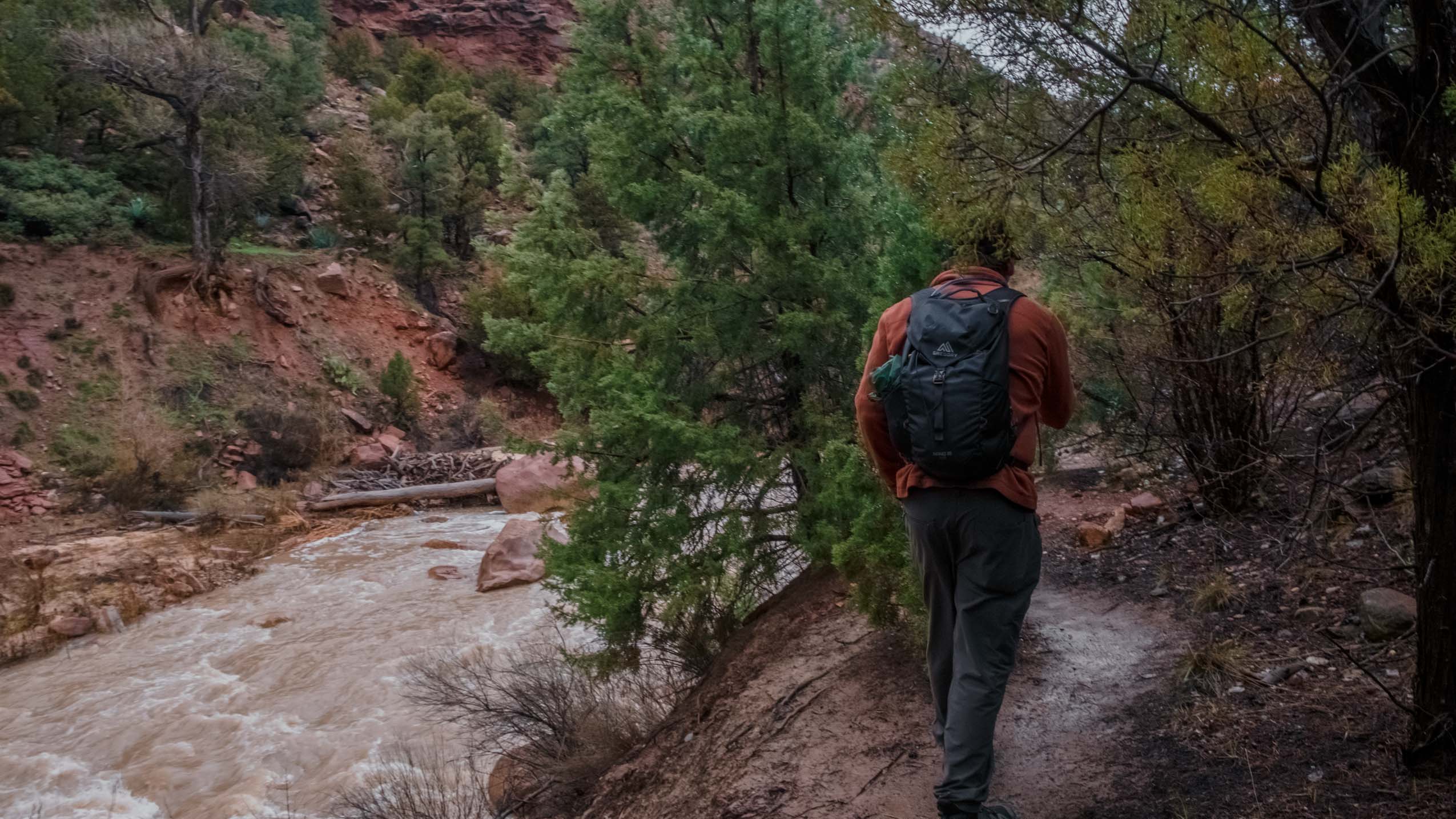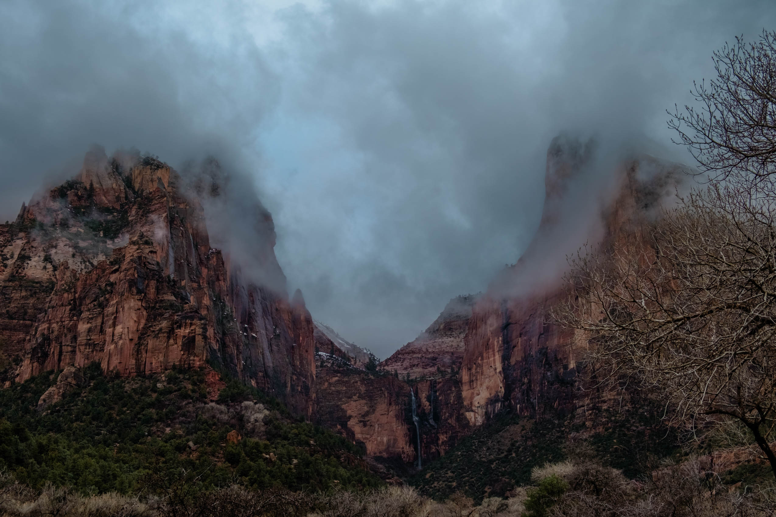 Continuing on from Page, AZ, we stopped for lunch at the famous Thunderbird restaurant in Mount Carmel Junction. This little restaurant holds a special place in my heart, as described in From Tucson to Salt Lake City, and Weekending in Bryce Canyon. And with our stomachs full, we continued into Zion National Park. Throughout our drive we’d encountered more of the same rain and thunderstorms we’d encountered the previous day hiking the Tanner Trail, and the dark clouds showed no sign of letting up as we drove the winding road down from the Zion-Mount Carmel Tunnel. After parking at the visitors center, instead of riding the famous Zion shuttle, we opted to set out on foot to immerse ourselves in the park’s beauty at a slower pace. After yesterday, the flat, easy walk was welcome and allowed us to adopt a relaxed pace. We meandered along the Virgin River that flows through the center of the park for as long as the terrain would allow, and then continued deeper into the park along the road with plans to simply catch one of the last shuttles back to the parking lot when we were done exploring. As the scheduled time of the last shuttle neared, we headed back to one of the shuttle stops. We were several hundred yards away when we looked over our shoulders and saw the shuttle rapidly approaching. This sent us sprinting down the road, our joints still aching from the day prior, arriving at the shuttle stop just as the bus opened its doors. We climbed on board, rode to the parking lot, and then drove out of the park toward Las Vegas where we’d spend the next few days rejuvenating in man-made luxury.
